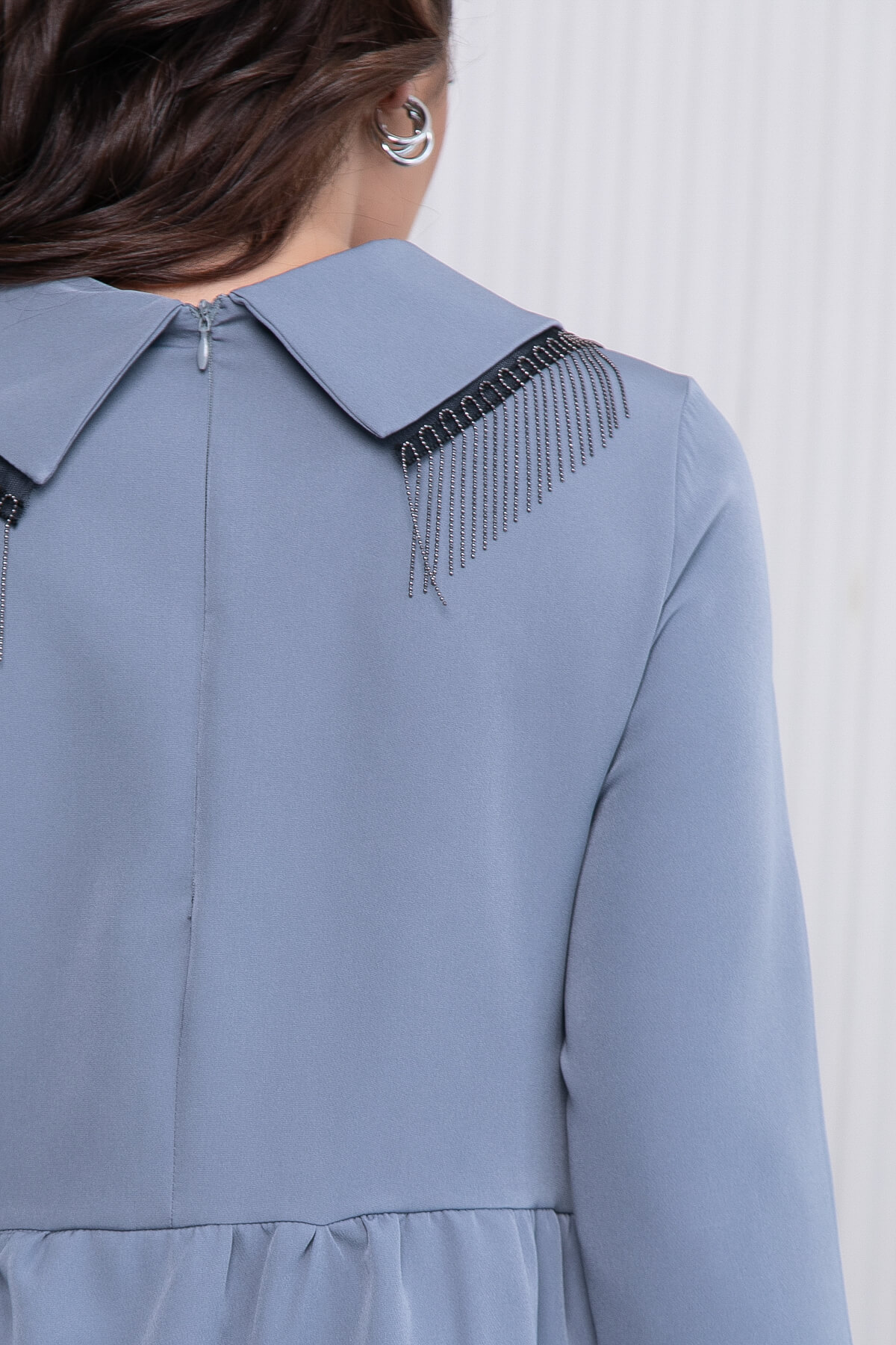 Женственное платье поможет в создании красивого делового образа. Украшением платья служит пышная юбка и отложной ворот, декорированный металлической бахромой. Платье ярусное, талия отрезная.