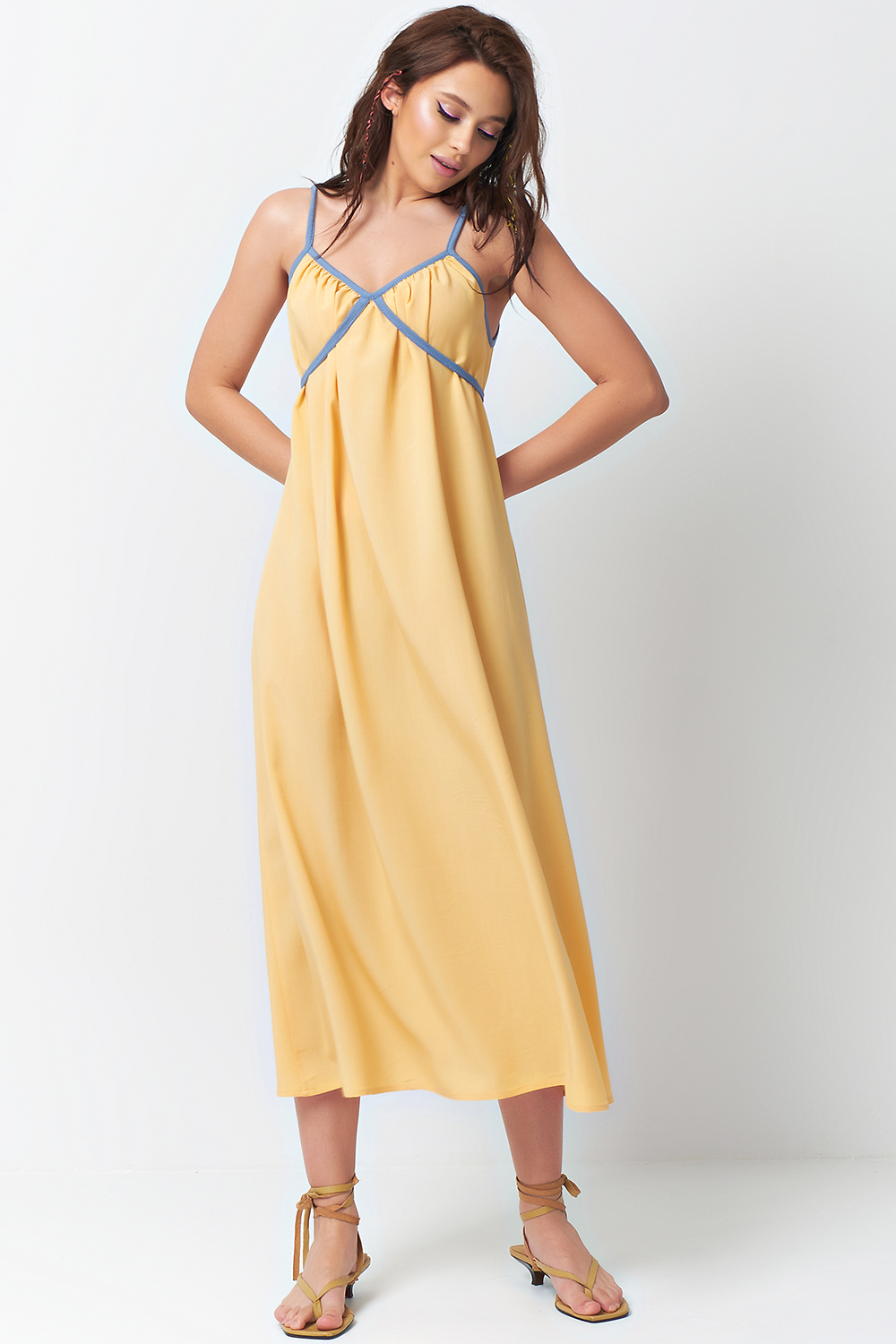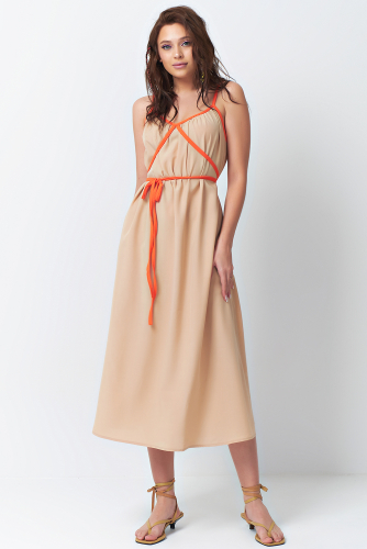 • Особенности: Расклешеное платье на бретелях. Детали: сборка по линии горловины переда и спинки, окантовка из отделочного материала, бретели с регуляторами длины, длинные завязки-пояски. Без застежки.