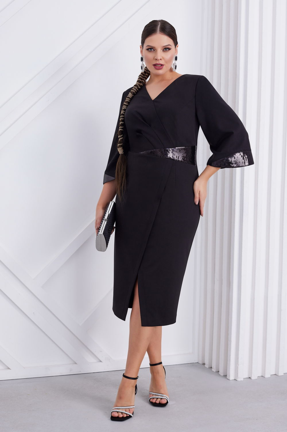 Платье зрительно заужает фигуру вытягивает силуэт и очень сильно стройнит современный вариант «a little black dress» для женщин с роскошными формами и утонченным чувством вкуса.