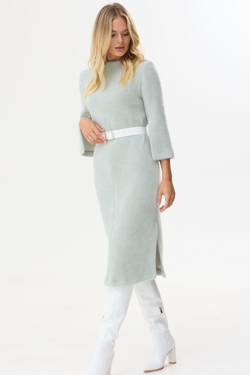 Платье полуприлегаюшего силуэта из мягкого и комфортного трикотажного полотна. Горловина с цельнокроенной стойкой. Рукав втачной с декоративным разрезом. По переду шов.В комплект входит съемный ремень. Обращаем ваше внимание, что фурнитура может незначительно отличаться от фото.