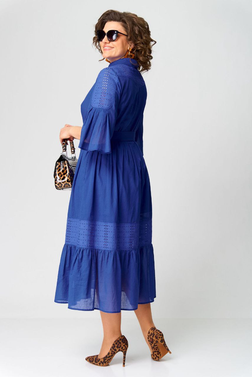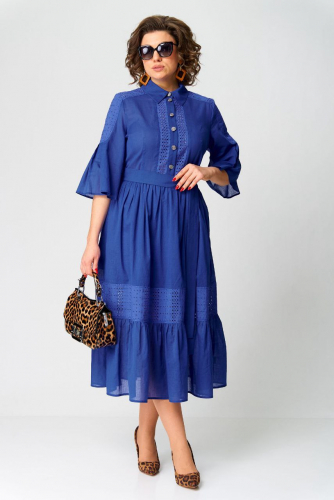 Платье женское нарядно-повседневное полуприлегающего силуэта до талии расширенное к низу. Выполнено из хлопка в сочетании с отделкой из хлопокового шитья. Вырез горловины воротик на стойке рубашечного типа, рукав втачной с отделочными вставками из шитья. расширенный к низу за счет встречных складок. По талии и по нижнему волану юбки сборка и отделочная вставка из шитья. По верхней части спинки фигурная кокетка из шитья. Застежка до талии на обметанные петли и пуговицы. Декором платья служит съемнй пояс из основной ткани.