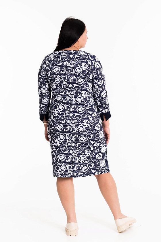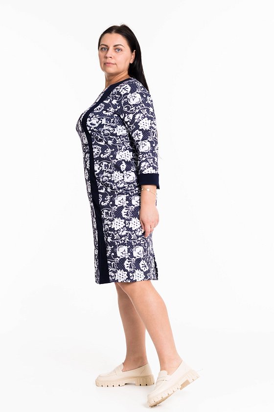 Женское платье выполнено из полотна академик. Горловина имеет круглый вырез, рукава длинные. В качестве отделки однотонные вставки из отделочного полотна.