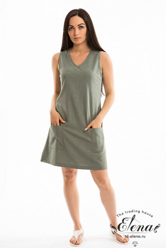 Платье из х/б полотна с отделочными деталями из однотонной ткани. С карманами по бокам. На планках горловины и карманов в качестве украшений использованы пуговицы.