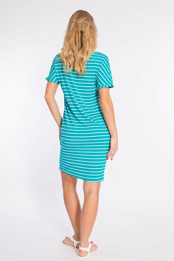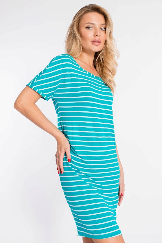 Платье выполнено из вискозы в полоску. Со спущенным рукавом и овальным вырезом горловины. Силуэт зауженный к низу.