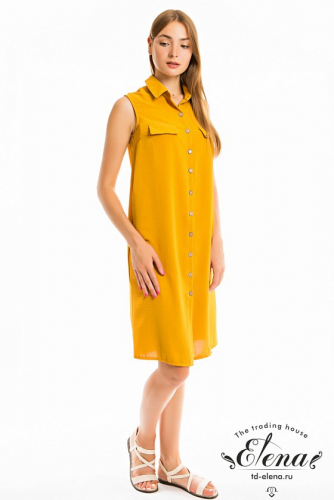 Платье выполнено из академика с набивным рисунком. Рукава длиной 3/4 и застёжка на пуговицы по всей длине изделия. Спереди и в боковых швах платья расположены карманы, линия талии подчеркивается поясом.