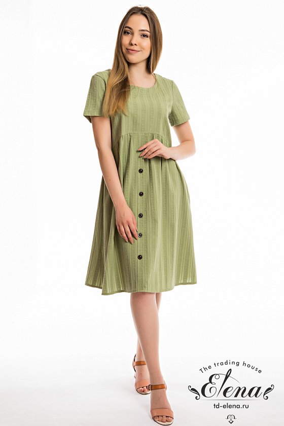 Платье из однотонного хлопка жаккард. С коротким втачным рукавом и овальным вырезом горловины. Спереди и на спинке фигурная линия отреза юбки. Юбка со сборкой, спереди застрочена складка, имитирующая застёжку на пуговицы. В боковых швах расположены карманы.