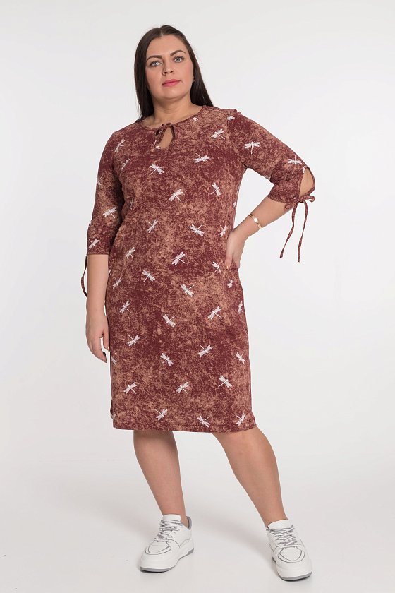 Платье из кулирки с набивным рисунком, с рукавом длиной 3/4. С карманами в боковых швах. На полочке нагрудные вытачки, декоративные "капельки" с завязками по горловине и низу рукавов.