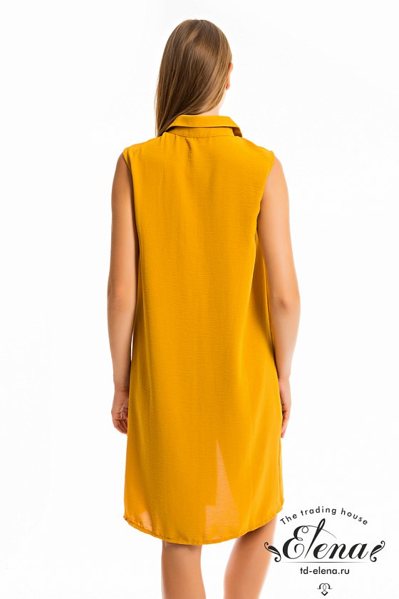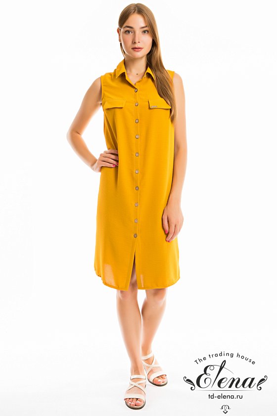 Платье из однотонного шёлкового крепа. Без рукавов, с застёжкой на пуговицы и воротником. На полочках нагрудные вытачки и декоративные клапаны.