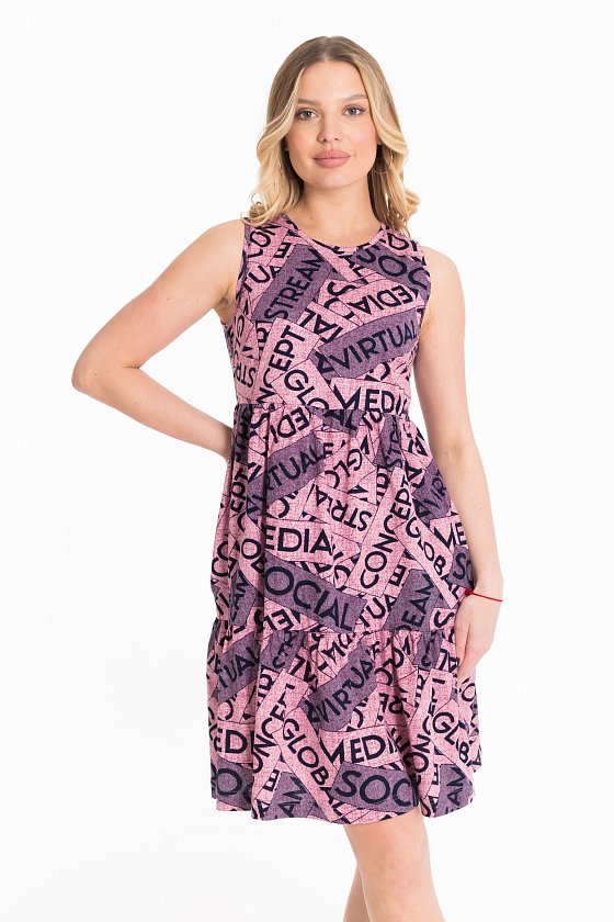 Платье выполнено из кулирки с набивным рисунком. Платье с завышенной линией талии и юбкой из двух ярусов со сборкой.  Горловина обработана бейкой, свободные концы завязываются на спинке. В боковых швах расположены карманы.
