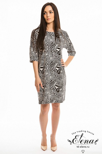 Платье выполнено из штапеля с набивным рисунком, со спущенным рукавом длиной до локтя. Вырез горловины овальный. Платье короткое, объёмное в верхней части.