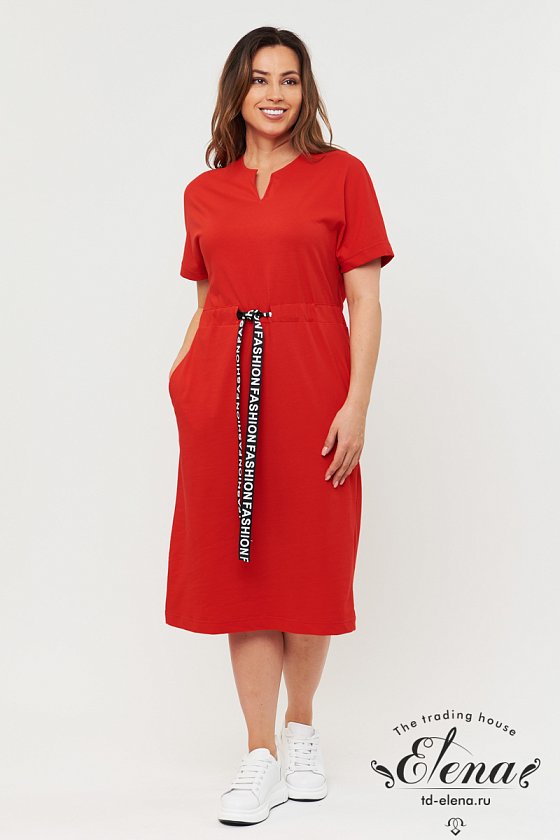 Платье выполнено из х/б полотна. Вырез горловины фигурный, рукава короткие. В кулисе по талии вставлена тесьма с надписью. По бокам размещены карманы.