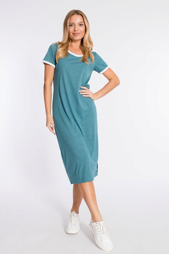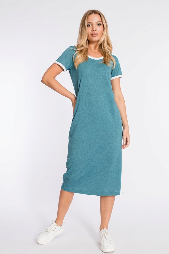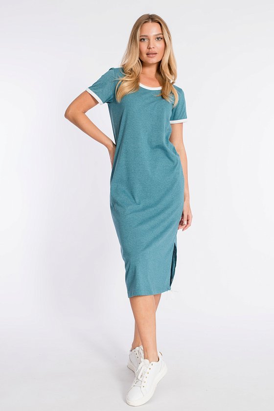 Платье прямого силуэта с разрезом внизу выполнено из хлопкового полотна. Короткие рукава и вырез горловины обработаны бейкой контрастного цвета.