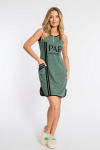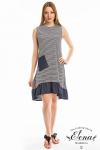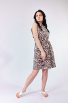 Платье из х/б полотна с набивным рисунком. Проймы, горловина и срезы карманов обработаны бейкой. По бокам размещены карманы, а внизу платья - разрезы.