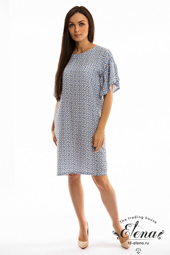 Платье из штапеля c набивным рисунком. Вырез горловины овальный. Платье свободного покроя со спущенным рукавом в виде широкой оборки.