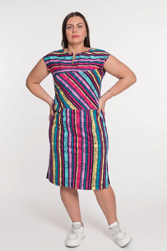 Лёгкое летнее платье из кулирки, 100% хлопок. Линия плеча спущена, спереди на горловине декоративный разрез. Внизу, по бокам, также расположены разрезы.