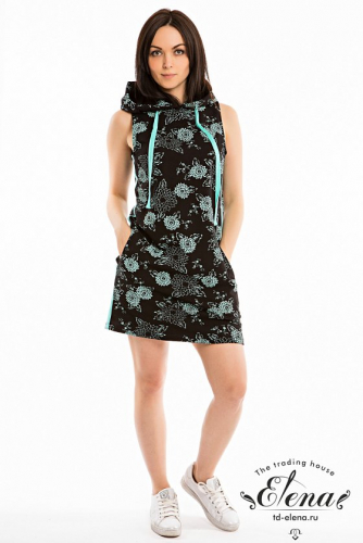 Летнее платье облегающего силуэта. Круглый вырез горловины и низ рукавов оформлены планками. Спереди термопечать.