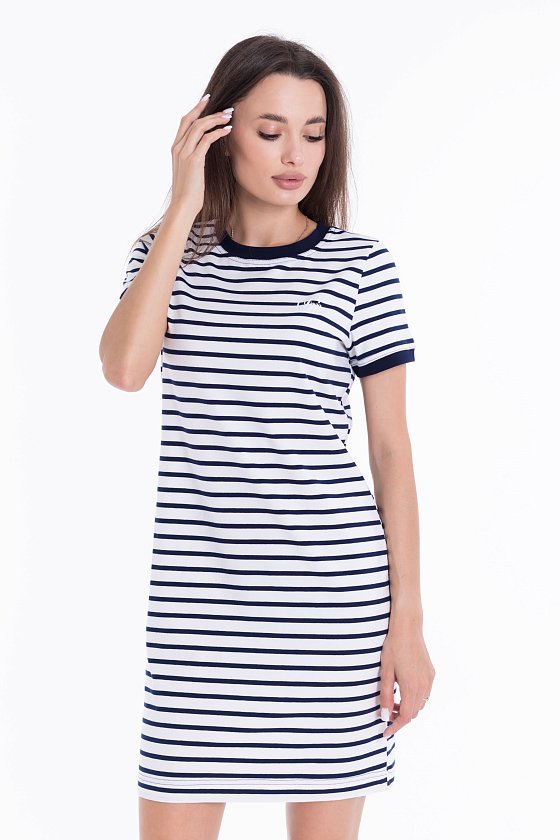 Летнее платье облегающего силуэта. Круглый вырез горловины и низ рукавов оформлены планками. Спереди термопечать.