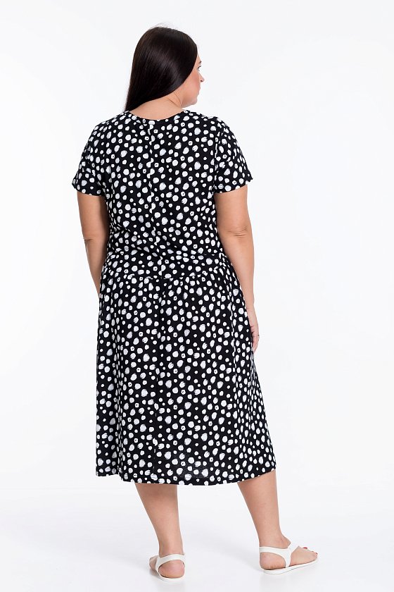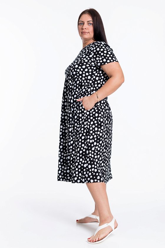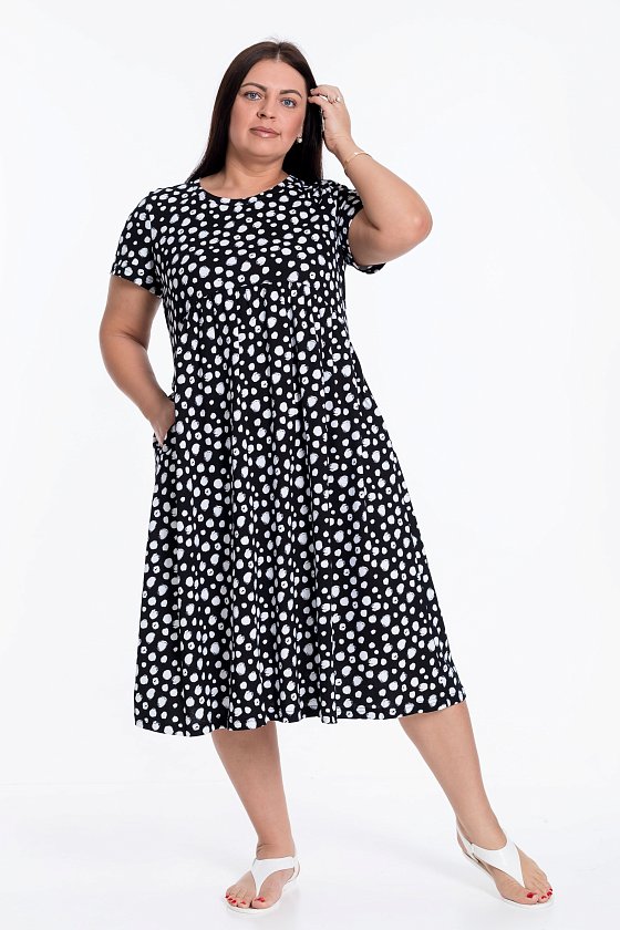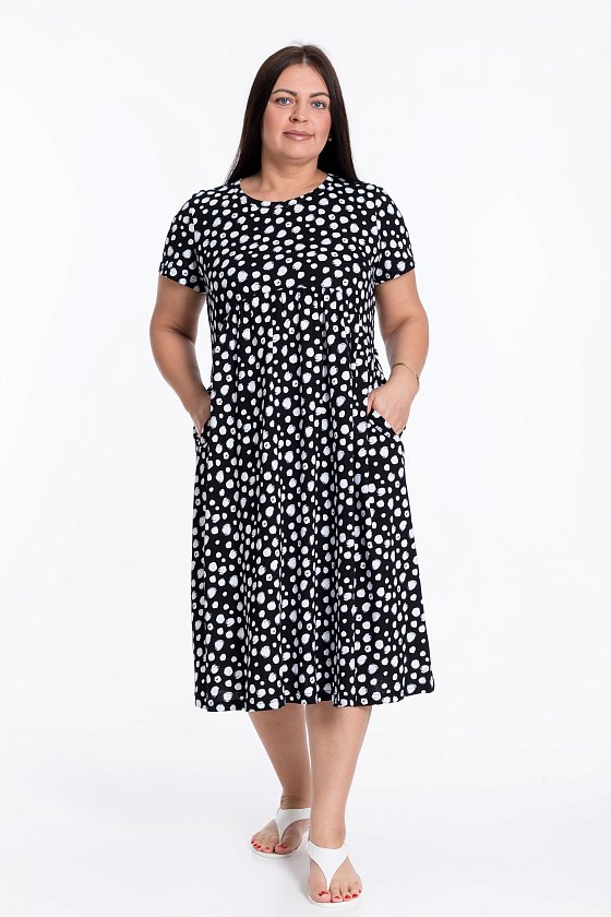 Платье из кулирки с коротким втачным рукавом и овальной горловиной. На полочке и спинке фигурная линия отреза юбки. Юбка со сборкой. В боковых швах карманы.