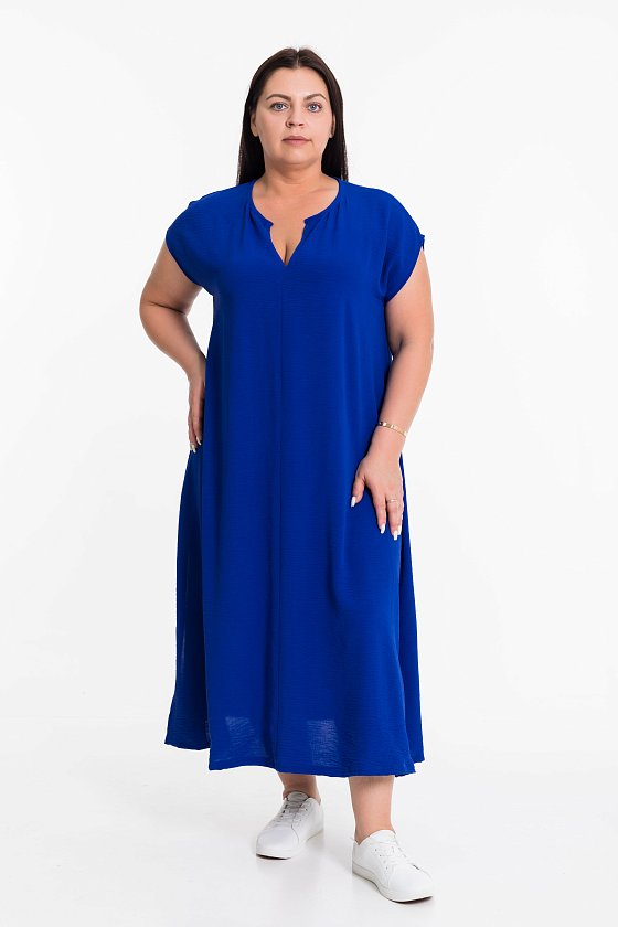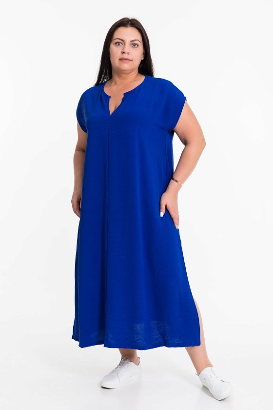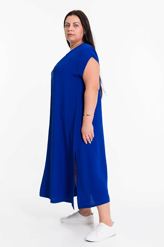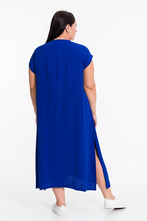 Платье выполнено из полотна "манго". Платье свободного силуэта, удлинённое, со спущенной линией плеча и декоративными разрезами по бокам снизу.