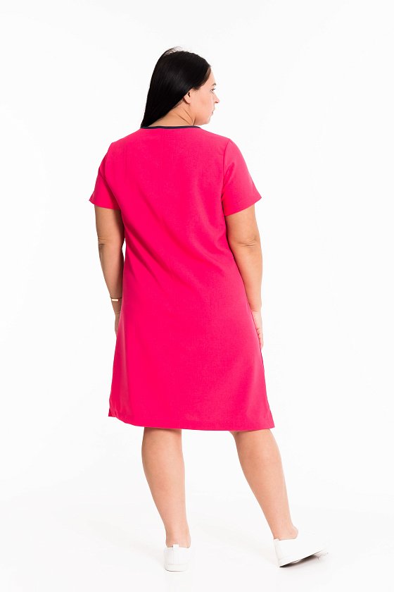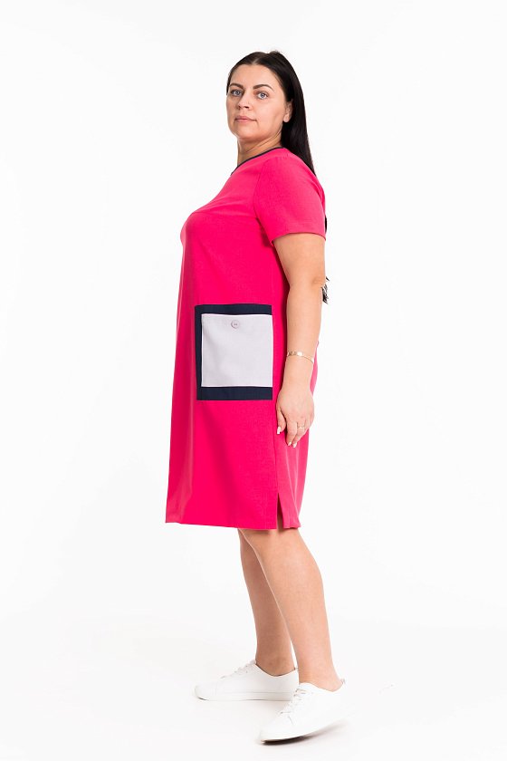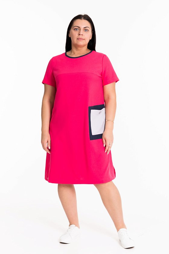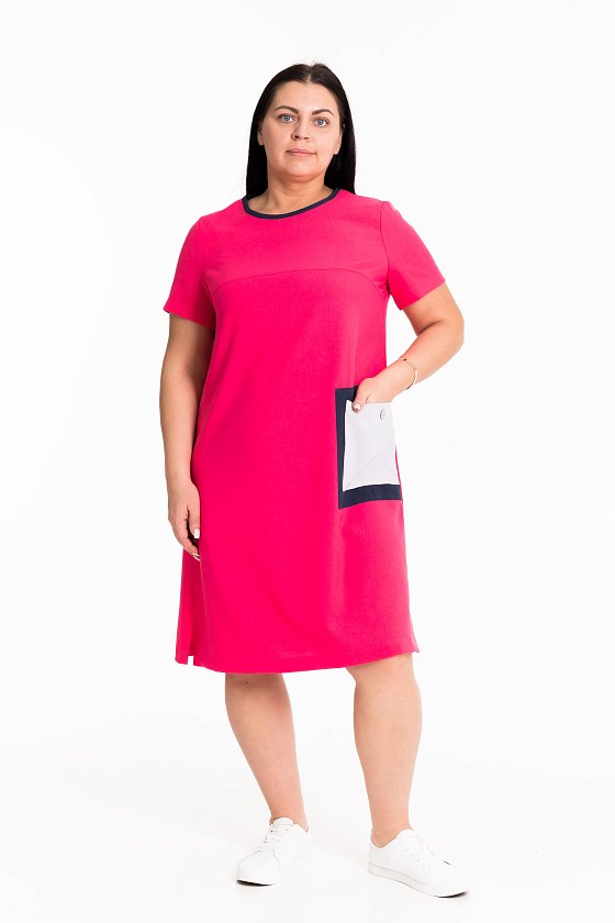 Платье с короткими рукавами выполнено из искусственного льна. По бокам декоративные разрезы, горловина оформлена бейкой контрастного цвета. Слева перед платья дополнен карманом.