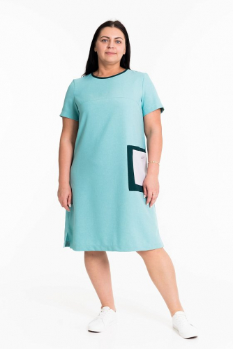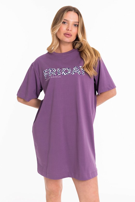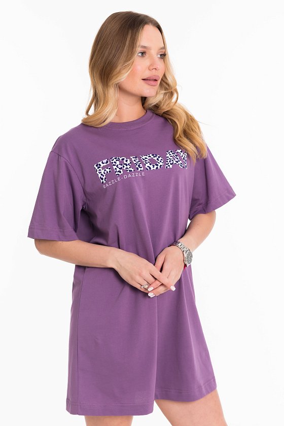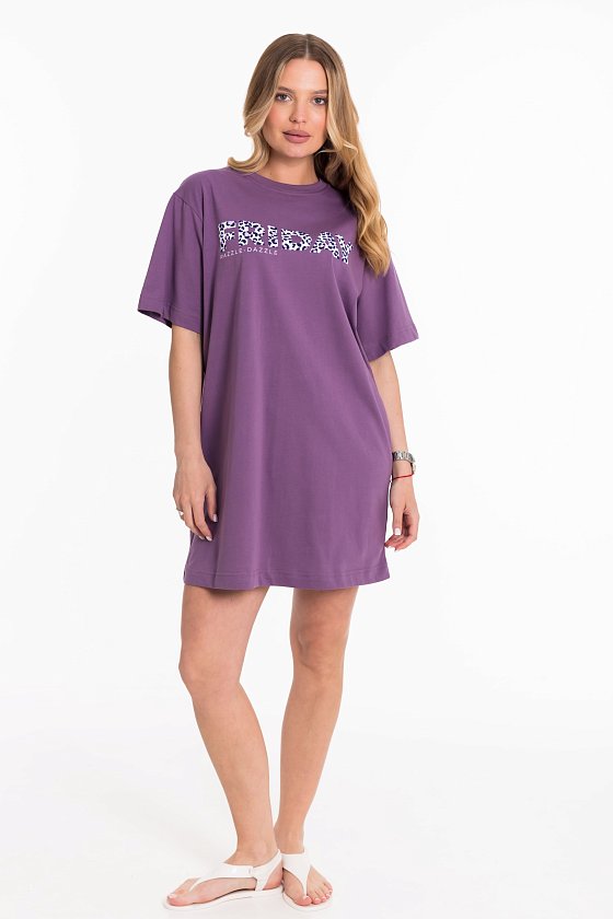 Платье свободного силуэта выполнено из однотонной кулирки. С коротким рукавом и принтом спереди. Круглый вырез горловины оформлен планкой.