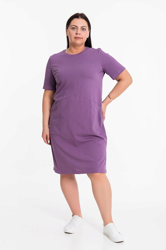 Женское платье выполнено из легкого хлопкового полотна лилового цвета. Круглый вырез горловины оформлен планкой. Спереди накладные карманы, по бокам, внизу декоративные разрезы. Уютный материал и стильный дизайн делают это платье практичным и привлекательным элементом одежды.