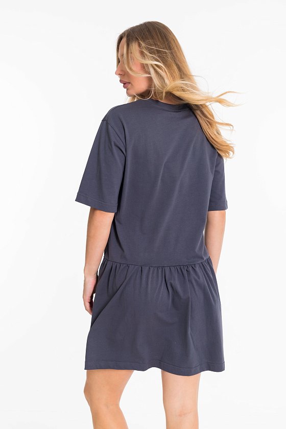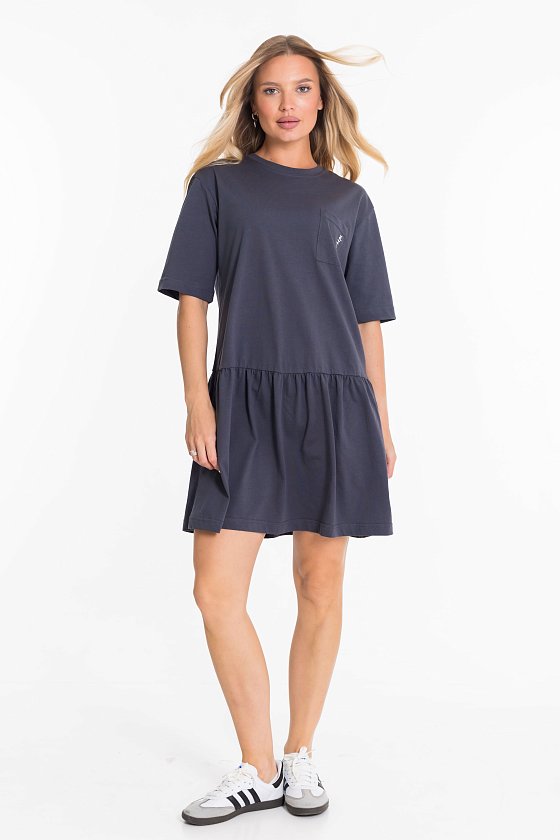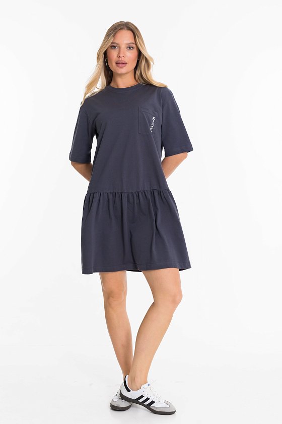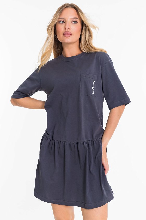 Платье свободного покроя выполнено из однотонной кулирки. Платье со спущенным рукавом, юбка слегка присборенная, с заниженной линией талии. С левой стороны накладной карман с принтом.
