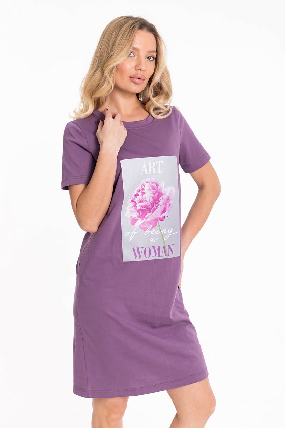 Платье выполнено из хлопкового полотна. Модель прямого кроя с короткими рукавами и круглым вырезом горловины, оформленным планкой. Спереди украшено стильным принтом, что придаёт образу яркость и индивидуальность.