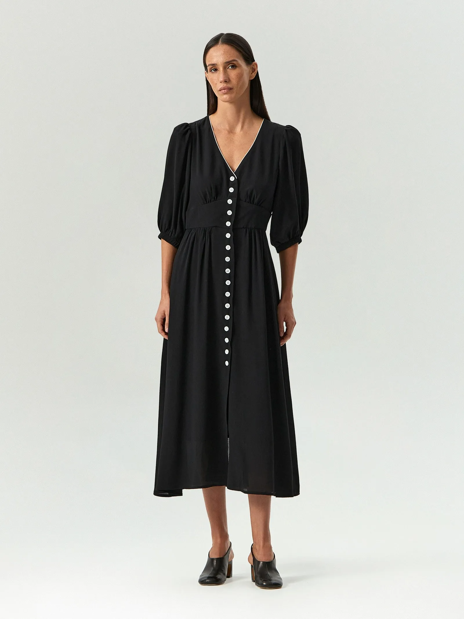 Платье на пуговицах с эффектом контраста. Белая фурнитура на чёрном фоне и белая окантовка по горловине делают образ более интригующим. Широкий фигурный втачной пояс красиво обхватывает талию. Рукав-фонарик чуть ниже локтя добавляет нарядности. Умеренно романтичное платье подойдёт и на каждый день, и к особому случаю. Под лёгкой вискозой — подкладка из хлопка: идеальный вариант на лето.