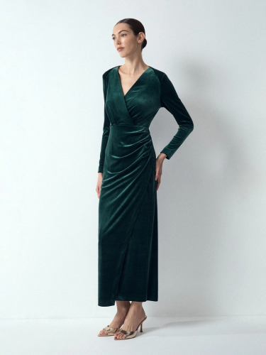 Платье в малахитовом цвете выполнено из нежного бархата: материал позволяет цвету раскрыть всю свою глубину и даёт красивые переливы. Бархат мягко облегает тело, красиво струится, делает образ женственным и роскошным. Модель с имитацией запаха и драпировками хорошо смотрится на разных типах фигур, визуально корректирует область живота и талии. Линия плеча красиво переходит вперед, добавляя изысканности. Платье станет украшением любого торжества и привлечёт много восхищенных взглядов