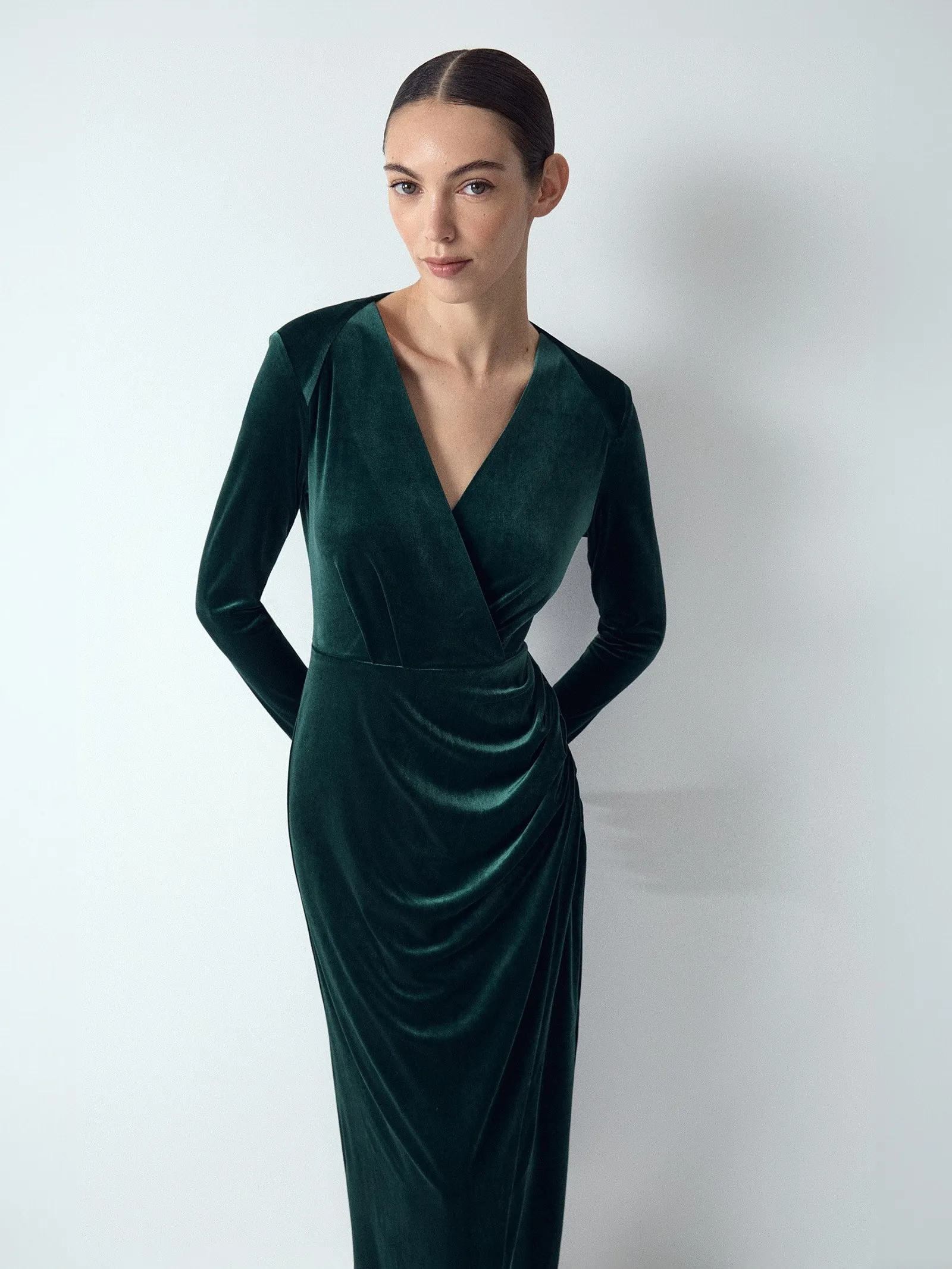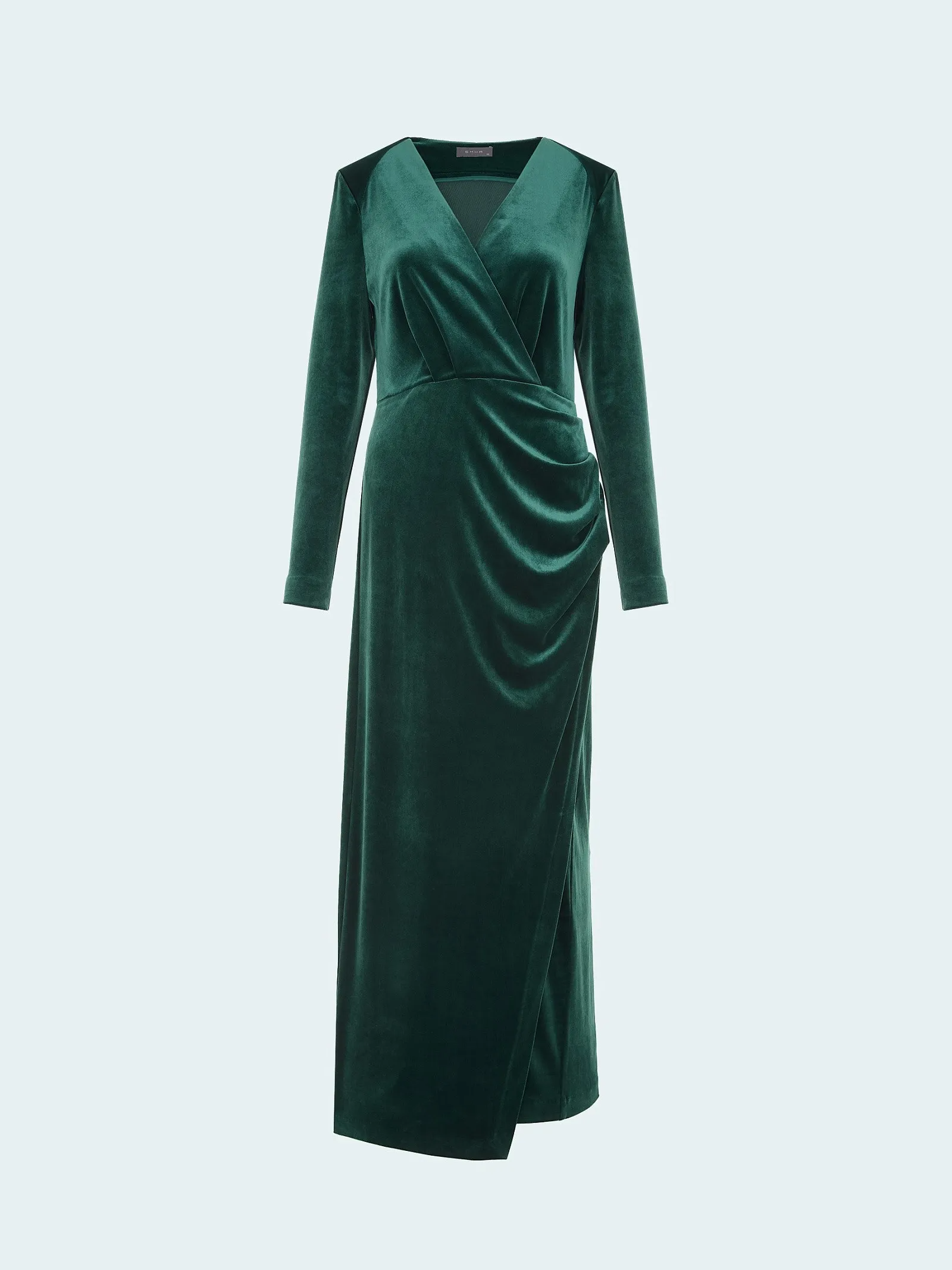 Платье в малахитовом цвете выполнено из нежного бархата: материал позволяет цвету раскрыть всю свою глубину и даёт красивые переливы. Бархат мягко облегает тело, красиво струится, делает образ женственным и роскошным. Модель с имитацией запаха и драпировками хорошо смотрится на разных типах фигур, визуально корректирует область живота и талии. Линия плеча красиво переходит вперед, добавляя изысканности. Платье станет украшением любого торжества и привлечёт много восхищенных взглядов.