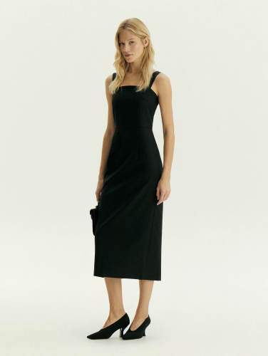 Незаменимое базовое платье в чёрном цвете. Тонкая и лёгкая ткань почти наполовину состоит из натуральной шерсти: то, что нужно на демисезон, прохладное лето, зиму. Платье одинаково хорошо и в офисных, и в коктейльных образах. Удобная модель без рукавов, на широких бретелях идеальна под жакеты. Открытая спина делает образ более эффектным. Приталенное платье-футляр в длине миди без лишнего декора поддержит дресс-код днём, подчеркнёт достоинства фигуры вечером. Вытачки визуально формируют и вытягивают силуэт, а отрезная талия корректирует область живота. Разрез со шлицей сзади усиливает динамику образа. Изделие застёгивается на молнию сзади. Платье может стать частью капсулы с топом и юбкой laine. Можно носить с тонкими лонгсливами нашей новой коллекции или любыми базовыми боди.