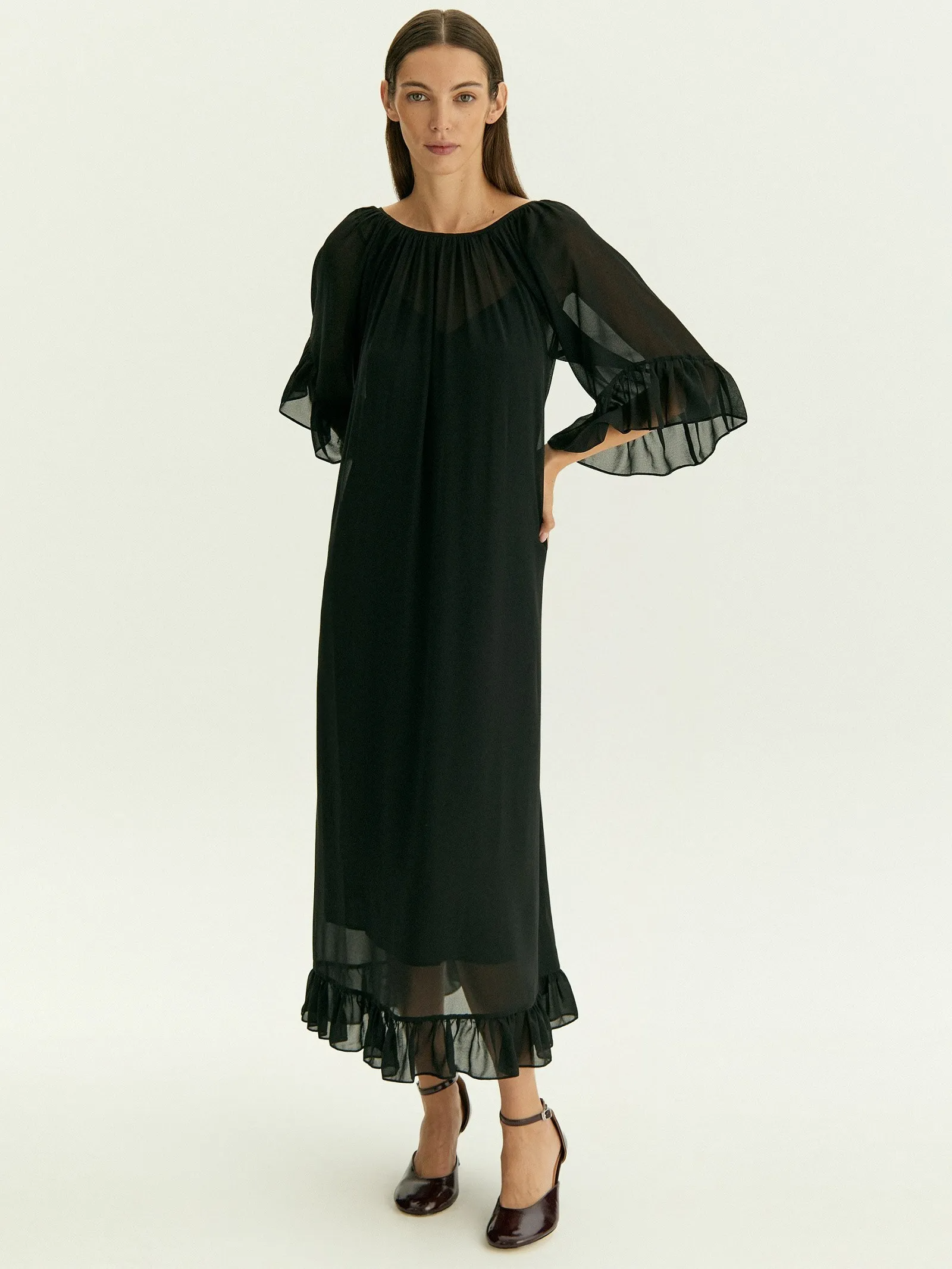 Летящее полупрозрачное платье из чёрного шифона подойдёт для особых случаев и под настроение. Образ с А-силуэтом, обнажённной спиной, открытыми руками, мягко спадающими на плечи оборками подчеркнёт хрупкость или мягкость в зависимости от особенностей телосложения. Глубокий вырез на спинке дополнен бантом. Платье идёт в комплекте с приятной к телу комбинацией из вискозы.