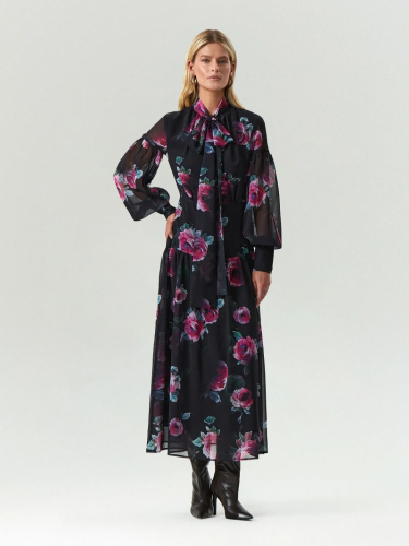 Нарядное шифоновое платье с крупным цветочным принтом порадует в будни и создаст настроение к особому случаю. Воротник-бант и сложный сборный рукав с широкими манжетами делает образ романтичным. Широкая отрезная часть между талией и юбкой красиво облегает фигуру. Платье поддерживает модный тренд на прозрачность. Выполнено с непросвечивающей подкладкой
