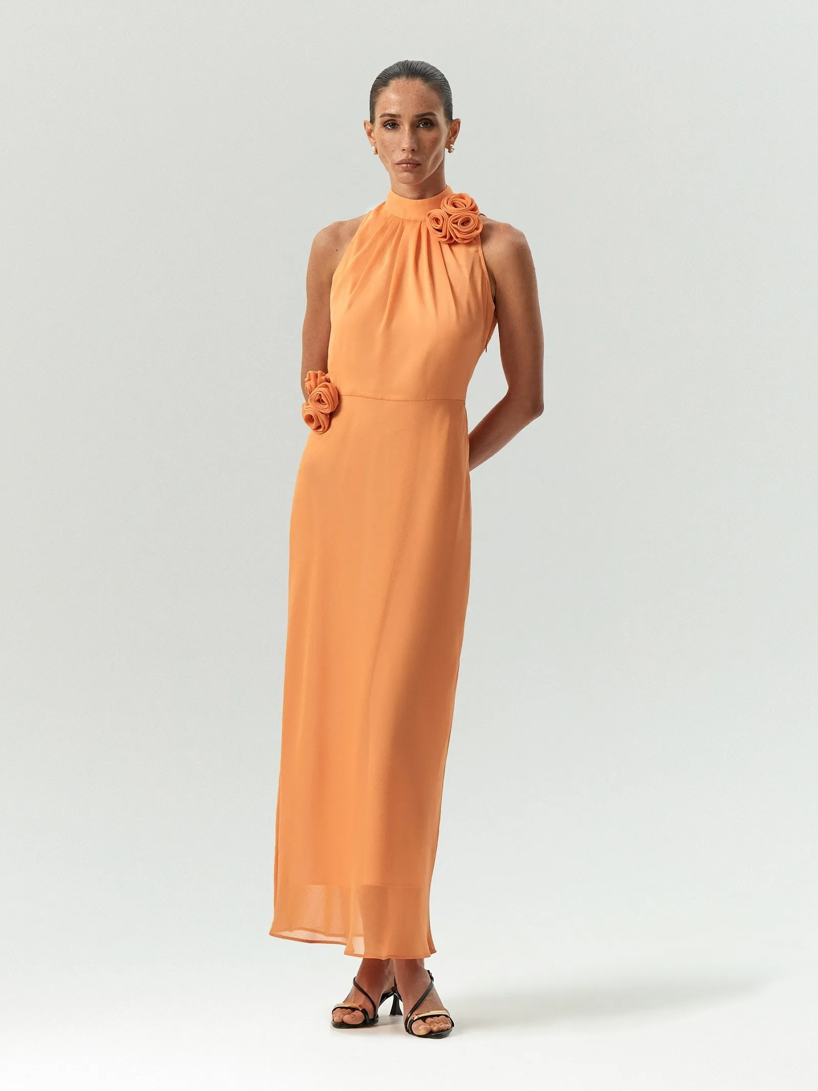 Жизнерадостный наряд к особому случаю в одном из самых модных оттенков сезона. Сочный персиковый цвет вызывает всплеск позитивных эмоций. Американская пройма делает образ эффектным. Объемный цветочный декор ручной работы придаёт лёгкую нотку кокетства, добавляет фантазийности. Такое платье отлично подойдёт для выпускного, коктейльной вечеринки, на свадьбу к друзьям, в отпуск. Платье выполнено из лёгкого полупрозрачного материала и дополнено непросвечивающей подкладкой. Застёгивается на молнию.