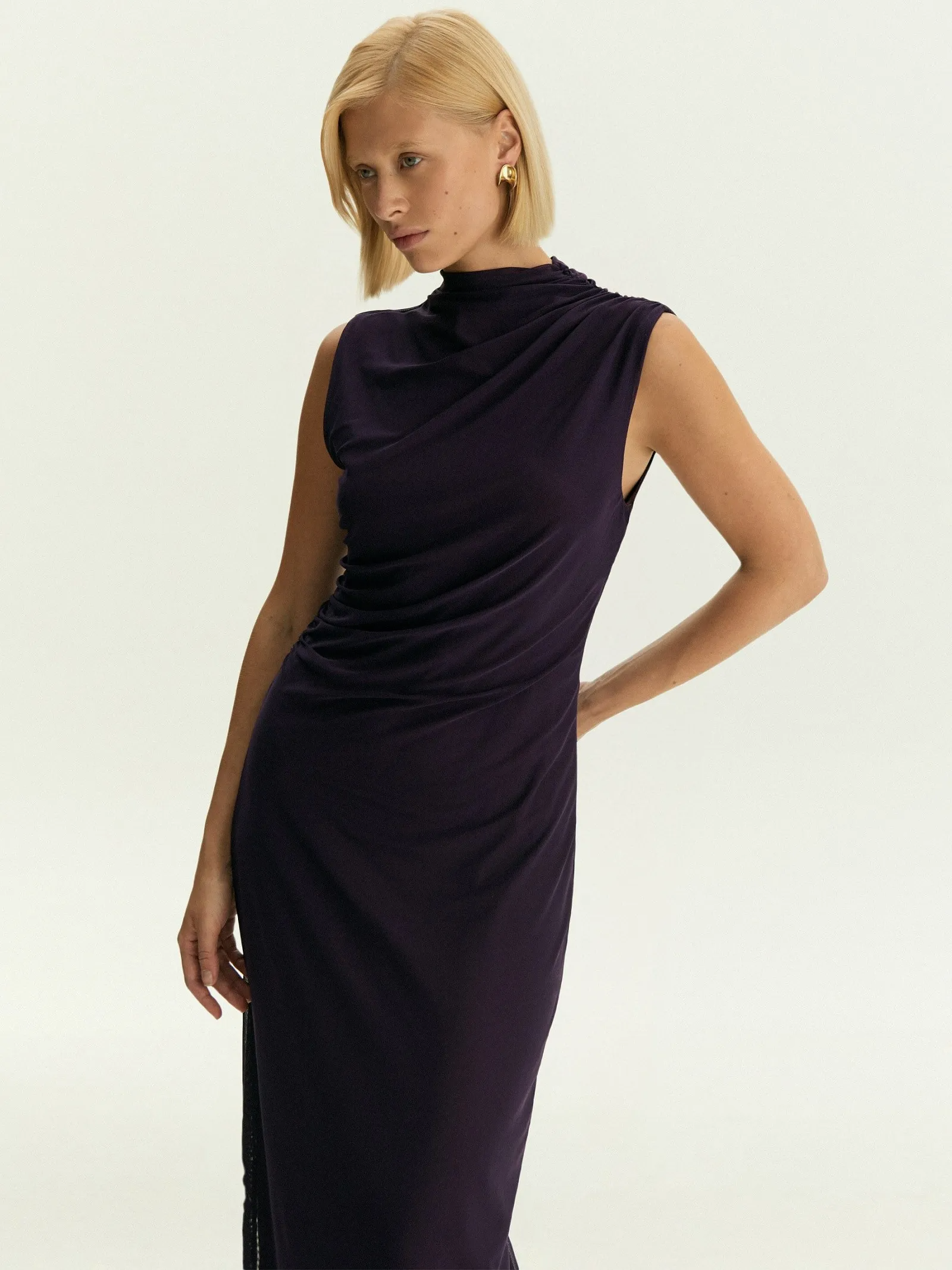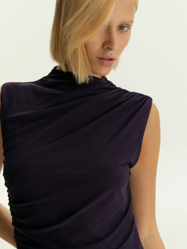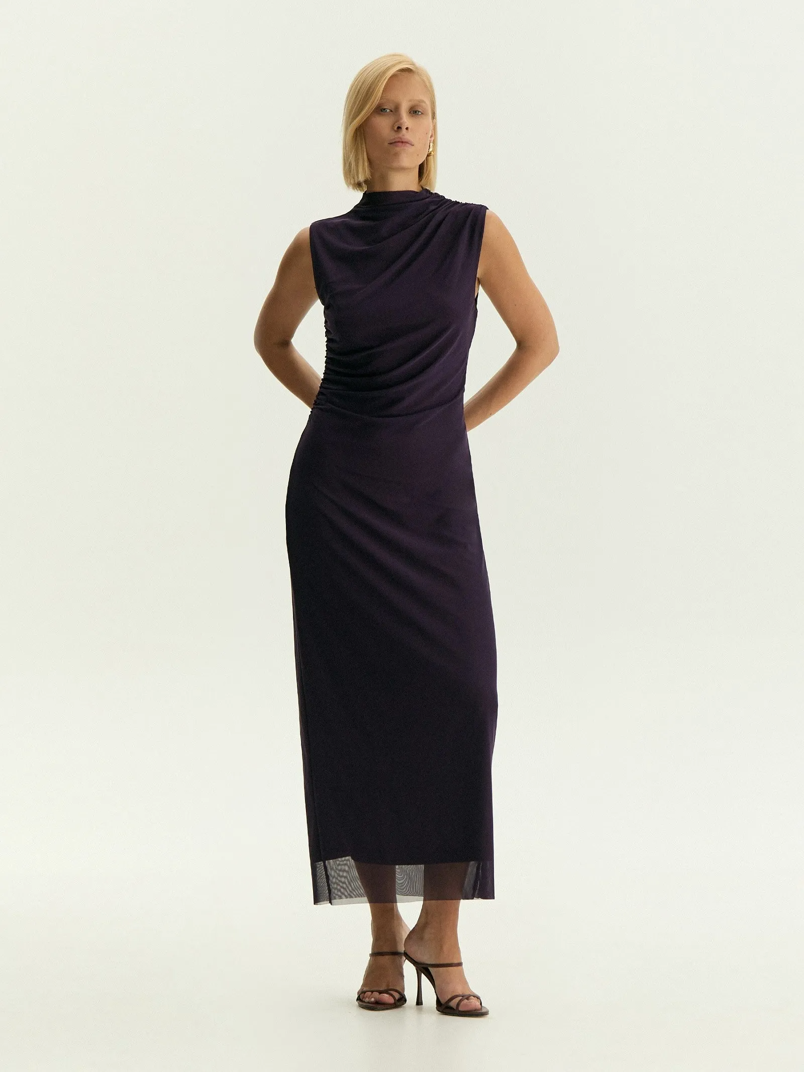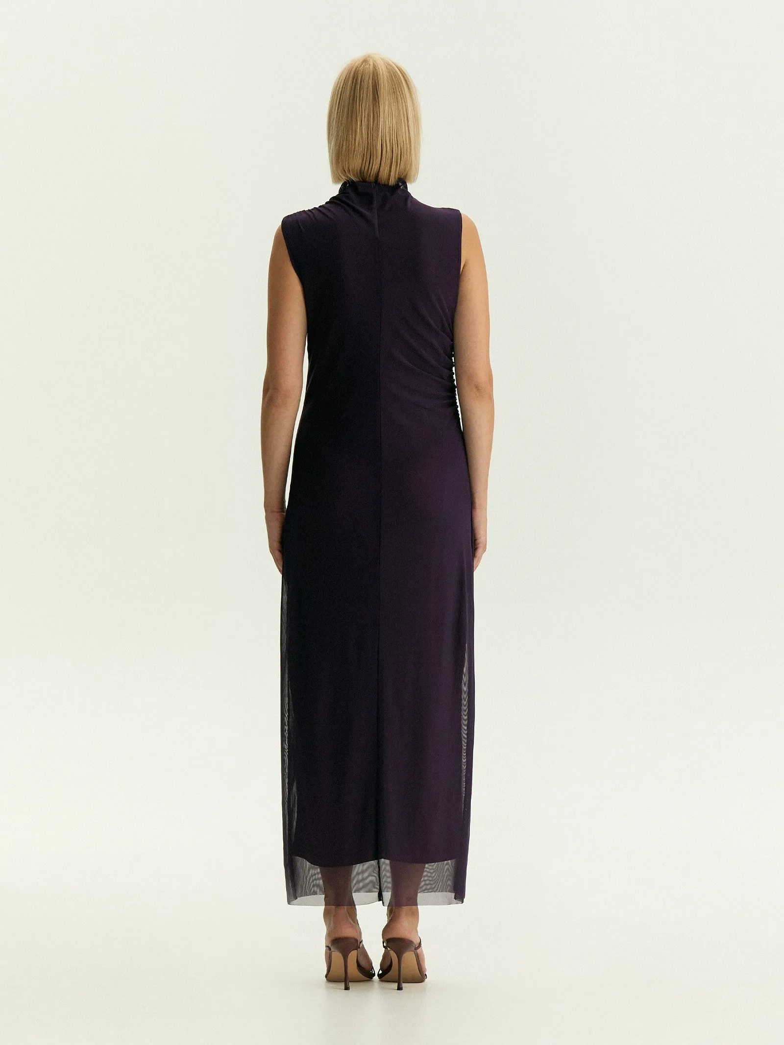 Платье макси без рукавов в модном виноградном цвете подойдёт и для повседневных образов, и для праздников: корпоратива, выпускного, свадьбы друзей. Тактильно приятная мягкая сетка на подкладке делает платье очень комфортным. Лёгкая драпировка на плечах и сбоку придаёт нарядности. Платье позволяет добавить заметные акцентные аксессуары. Изделие выполнено без застёжек.