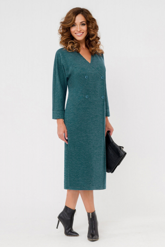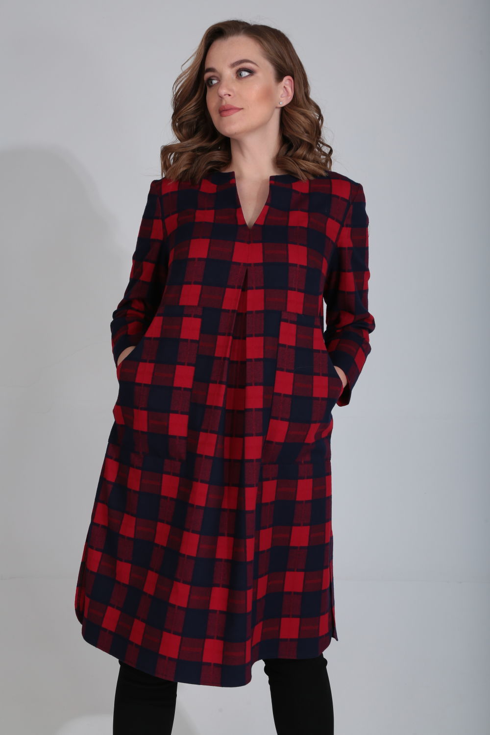 Платье женское свободного силуэта с горловиной округлой формы на планке и V-образным узким вырезом. Перед со встречной складкой от выреза по центру. Складка застрочена на расстоянии 10 см от верха. Нагрудные вытачки выходят из боковых швов. В области бедер большие накладные функциональные карманы фигурной формы, переходящие на спинку.