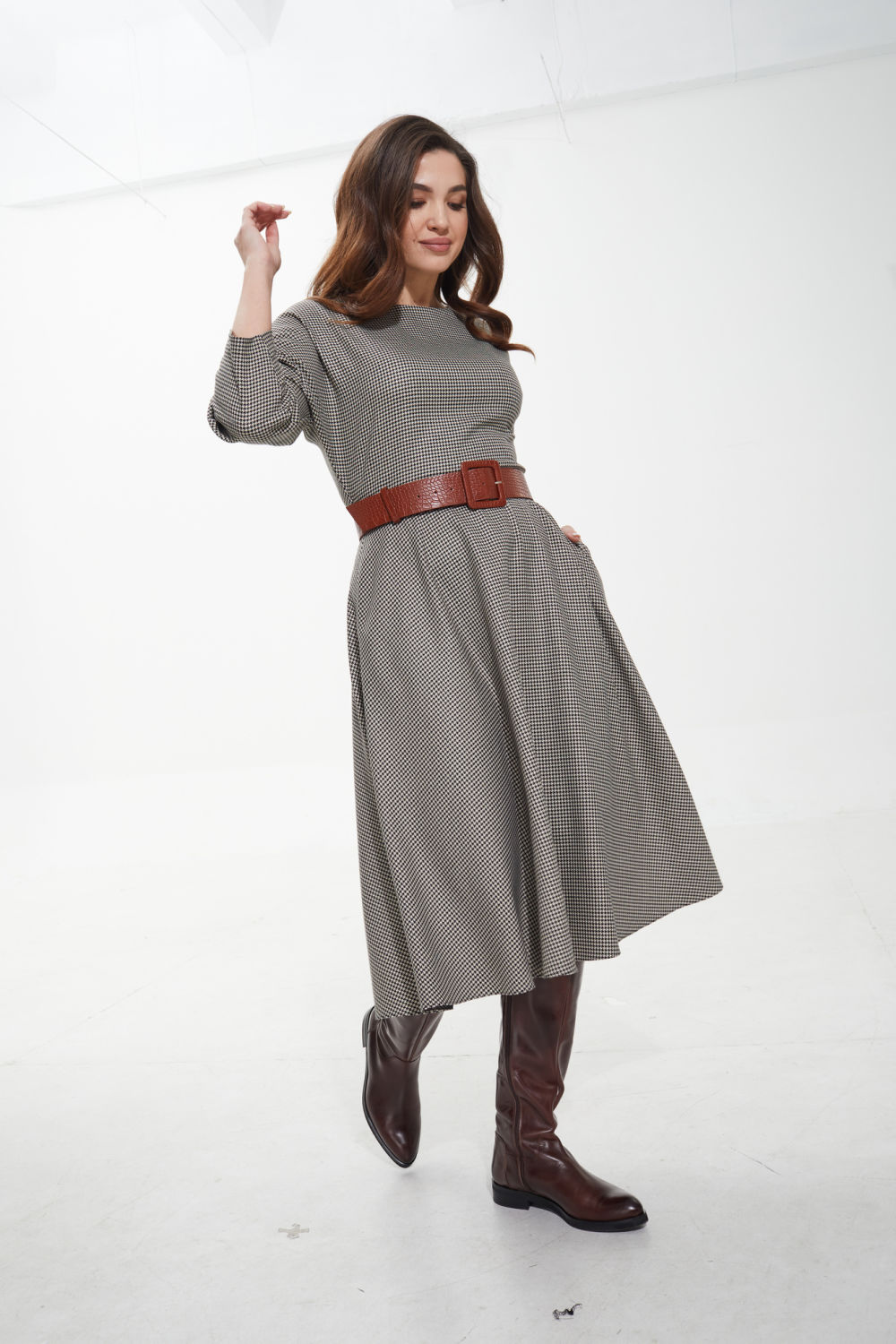 Платье приталенного силуэта, отрезное по линии талии. Лиф платья покроя "летучая мышь" с отрезными рукавами длиной 3/4. В боковых швах карманы. Горловина округлая, слегка расширенная. Спинка со средним швом, в котором выполнена потайная молния от верха до линии ниже талии. Платье в комплекте с декоративным ремнём.