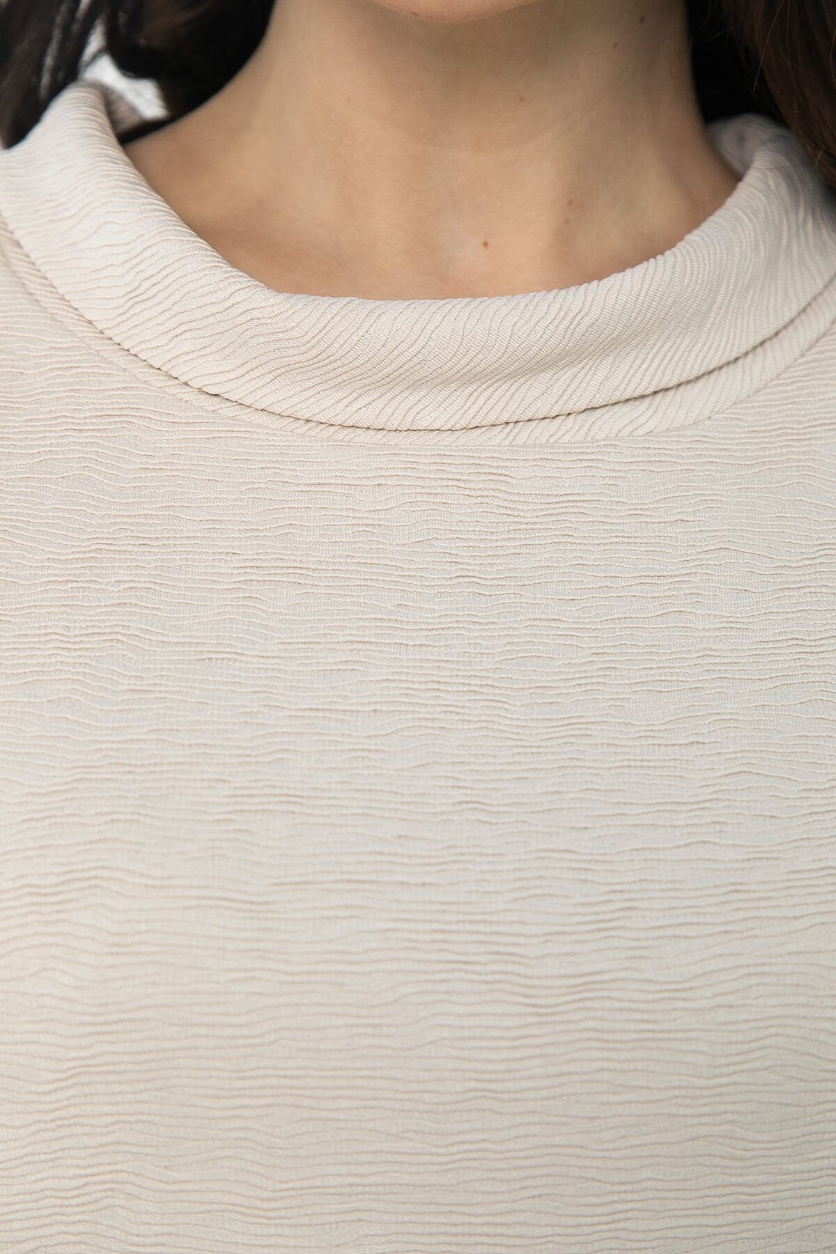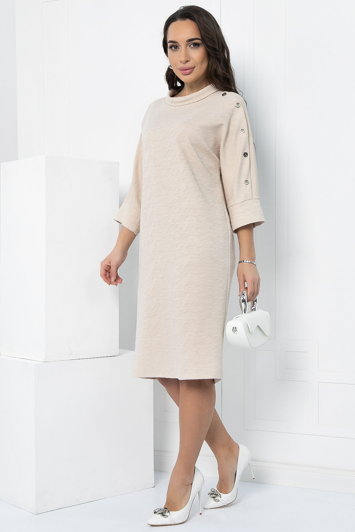 Платье прямого кроя будет уместно как для повседневных выходов, так и для особых случаев! Модель оснащена цельнокроеными рукавами на манжете, длина которых составляет три четверти. Небольшой воротник-хомут дополняет образ, придавая платью изысканный шарм. Декоративные пуговицы, расположенные на линии одного плеча, подчеркивают внимание к деталям, а текстурированная ткань создает интересный визуальный эффект.