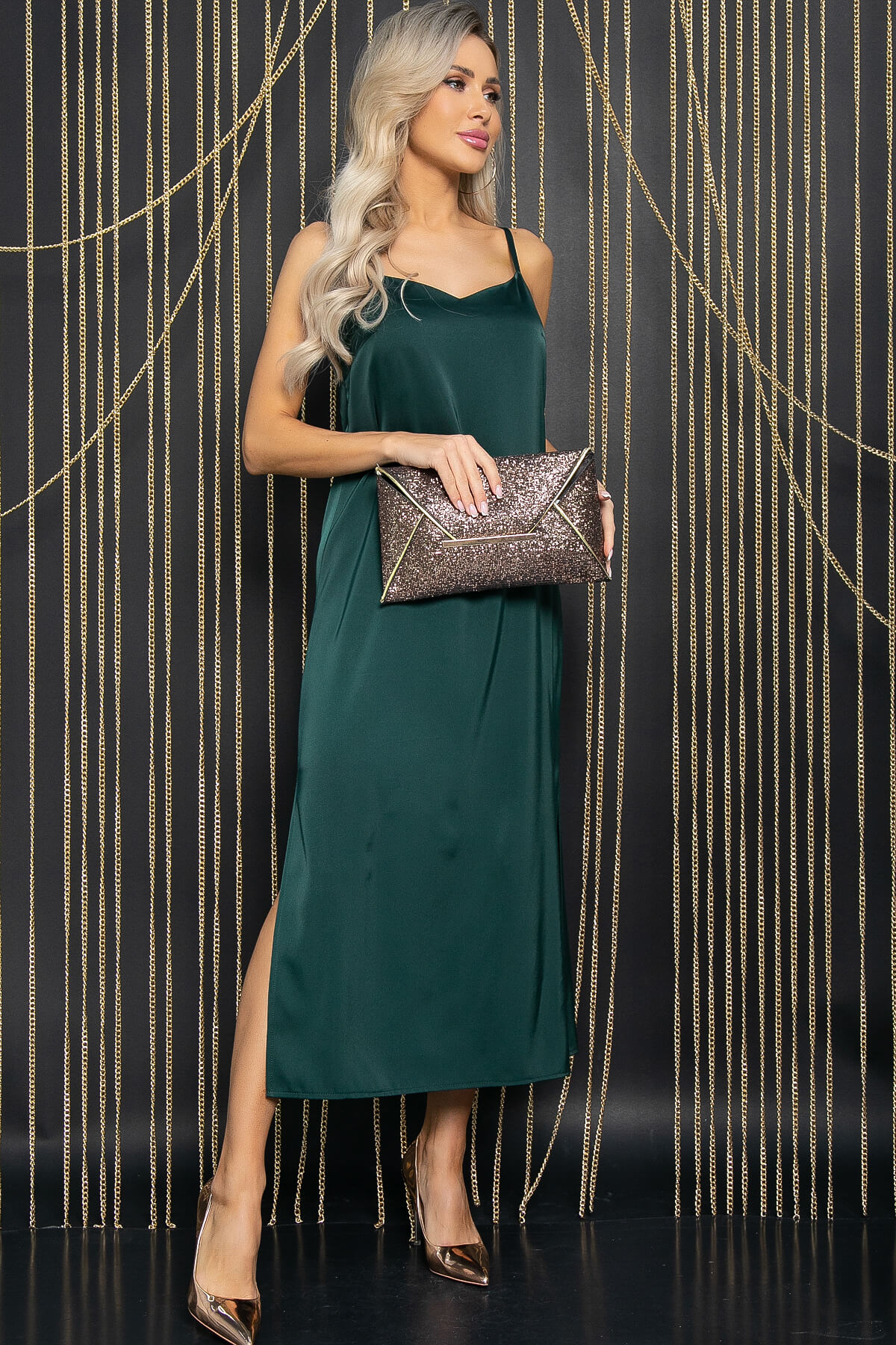 Классическое базовое платье-комбинация на регулируемых лямках с открытыми плечами — это идеальный выбор для создания элегантного образа на любом мероприятии. Благородный глубокий изумрудный цвет добавит загадочности вашему образу, делая вас особенно привлекательной. Можно дополнить поясом и аксессуарами, украшениями и туфлями. По бокам есть разрезы.