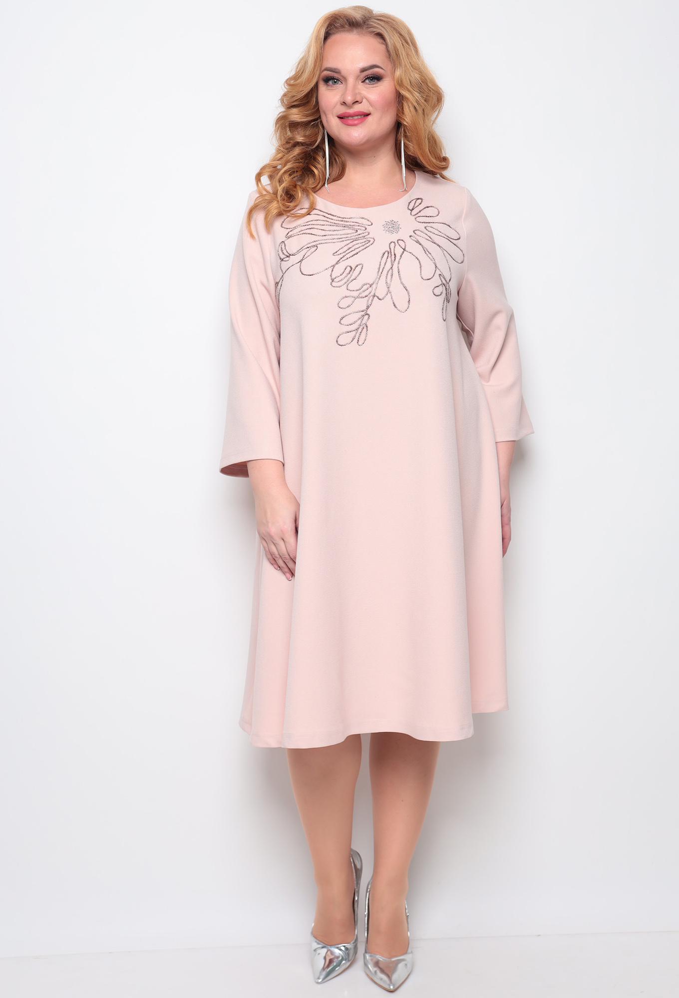 Платье А-образного силуэта выполнено из трикотажа средней плотности, простой крой и комфортность изделия сделают его незаменимым. Круглая горловина, свободный рукав 7/8. По переду изделия в качестве декора машинная вышивка. Платье прекрасно дополняется различными аксессуарами.