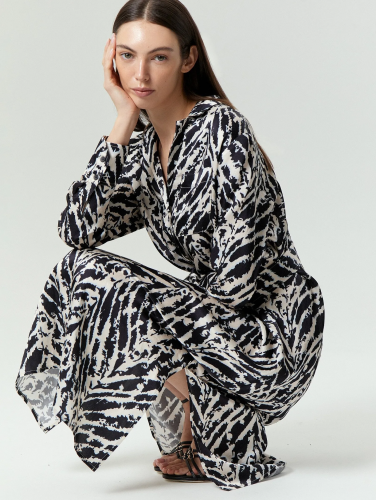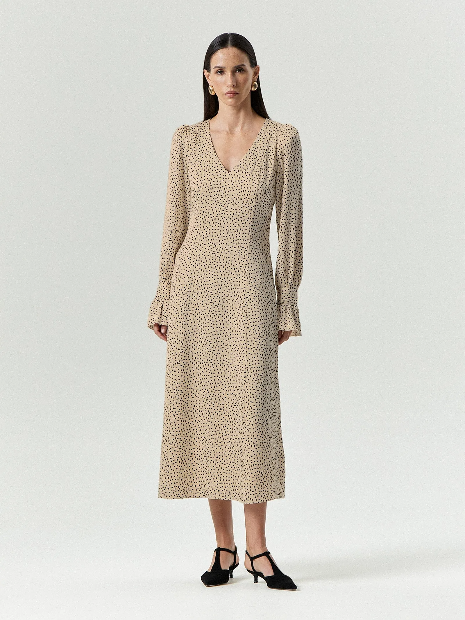 Аристократичное платье в мелкий горох добавит романтики будням и станет отличным выбором к особому случаю. Модель отличают нежные сборки по окату и удлинённый рукав с оборками на манжетах, также она имеет универсальный V-вырез. Очень красиво садится по груди и талии, сохраняет комфортный баланс облегания и свободы. Платье выполнено из приятной к телу шелковистой вискозы, на подкладке молочного цвета, которая не просвечивает.