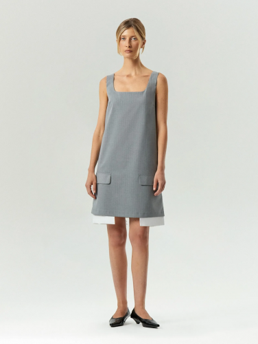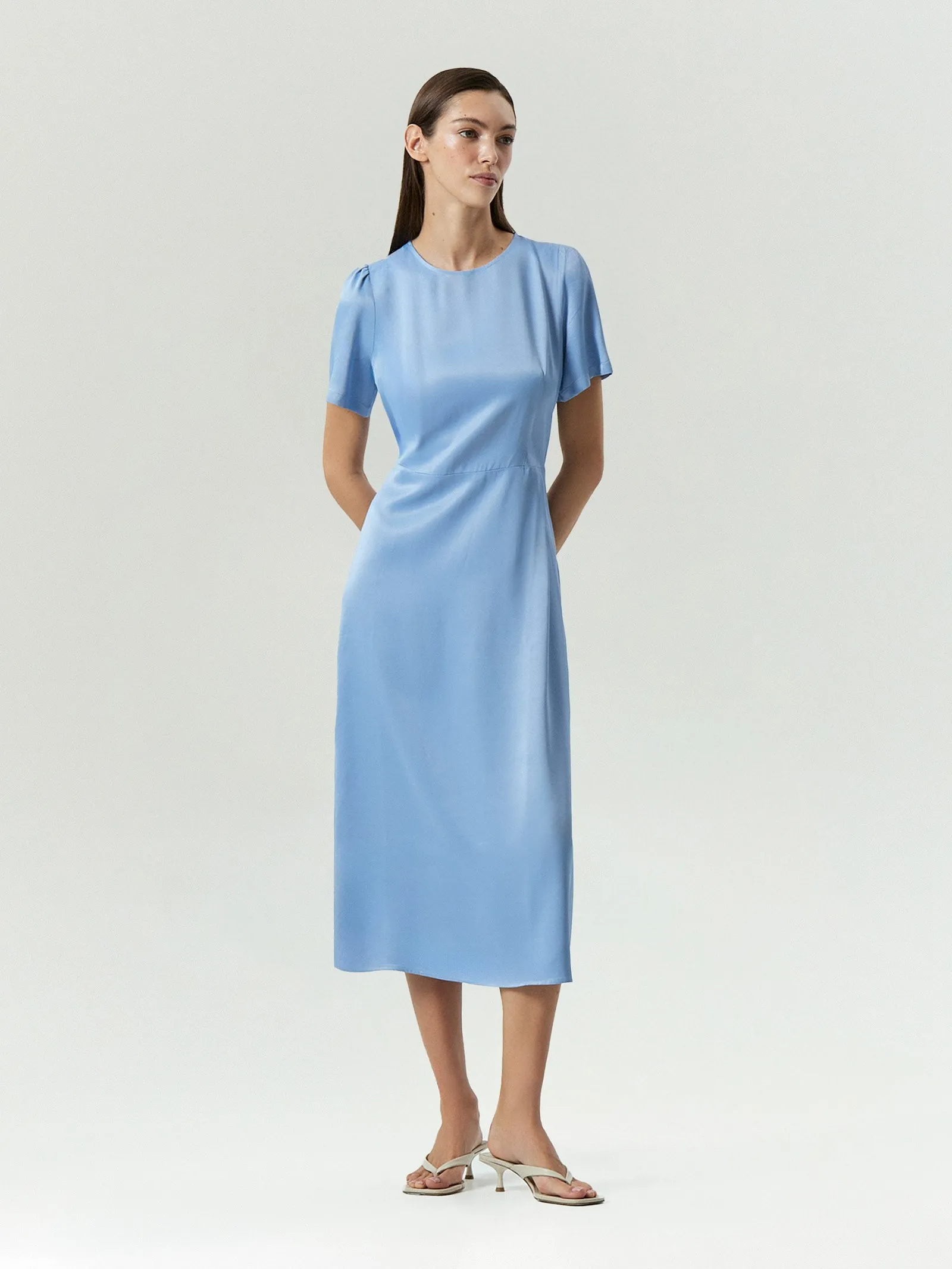 Универсальное платье на лето с коротким рукавом и круглым вырезом. Модный оттенок голубого радует глаз. Платье сделано из приятного к телу, мягкого и шелковистого вискозного сатина, без подкладки. Приталенная модель с юбкой A-силуэта и отрезной талией удачно садится на разные фигуры. Вытачки создают изящные пропорции. Платье застёгивается на молнию. Монохромная вещь с лаконичным кроем подходит под базовые и акцентные жакеты, позволяет экспериментировать с различными аксессуарами.