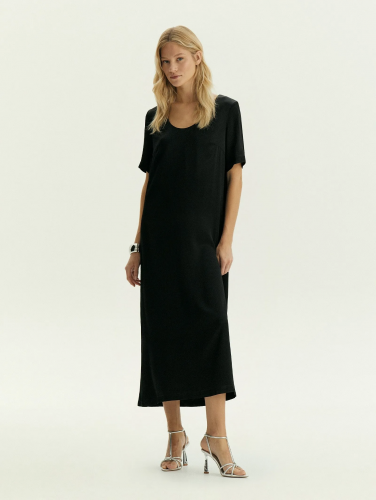 Лаконичное платье миди с коротким рукавом и U-образным вырезом захочется носить на любой случай. Для выхода на массаж и в бассейн, по магазинам и на прогулку, на работу и за город, для романтических планов и культурных событий — для этого платья любой повод хорош. Благодаря длине, универсальному фасону и монохромному цветовому решению оно уместно всегда. Оно позволяет экспериментировать с броскими аксессуарами или, наоборот, уйти в минимализм. Умеренно свободное платье садится на любую фигуру. Сделано из комфортной вискозы, без подкладки.