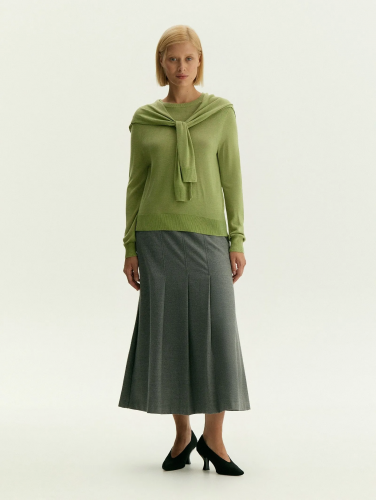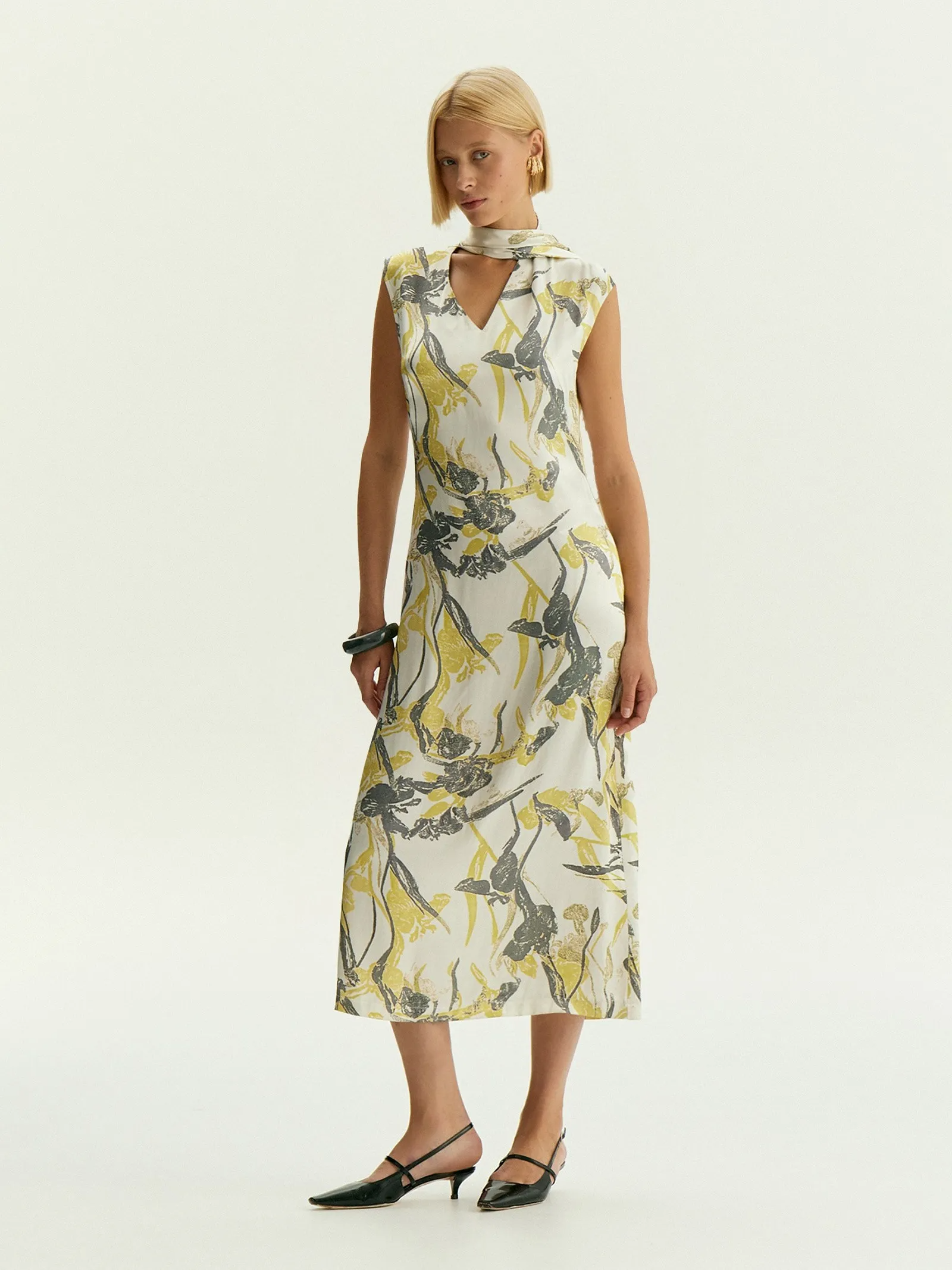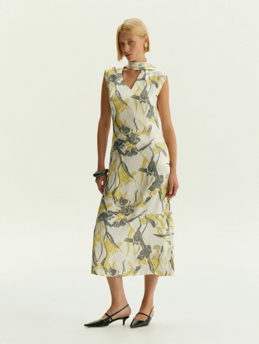 Элегантное платье-трансформер отличается оригинальным воротником, который переходит в шарф. Отлётную часть воротника можно стилизовать множеством разных способов, каждый раз создавая уникальный образ. Приталенная модель слегка прикрывает плечо и дополнена V-образным вырезом. Материал поддерживает модную палитру сезона: цвет лемонграсса сочетается в ней с мягкими оттенками серого. Принт оставляет впечатление свежести и в то же время лёгкой ностальгичности. При этом абстрактно-цветочные мотивы звучат актуально. Платье сделано из приятной к телу вискозы, без подкладки. Застёгивается на молнию сбоку.