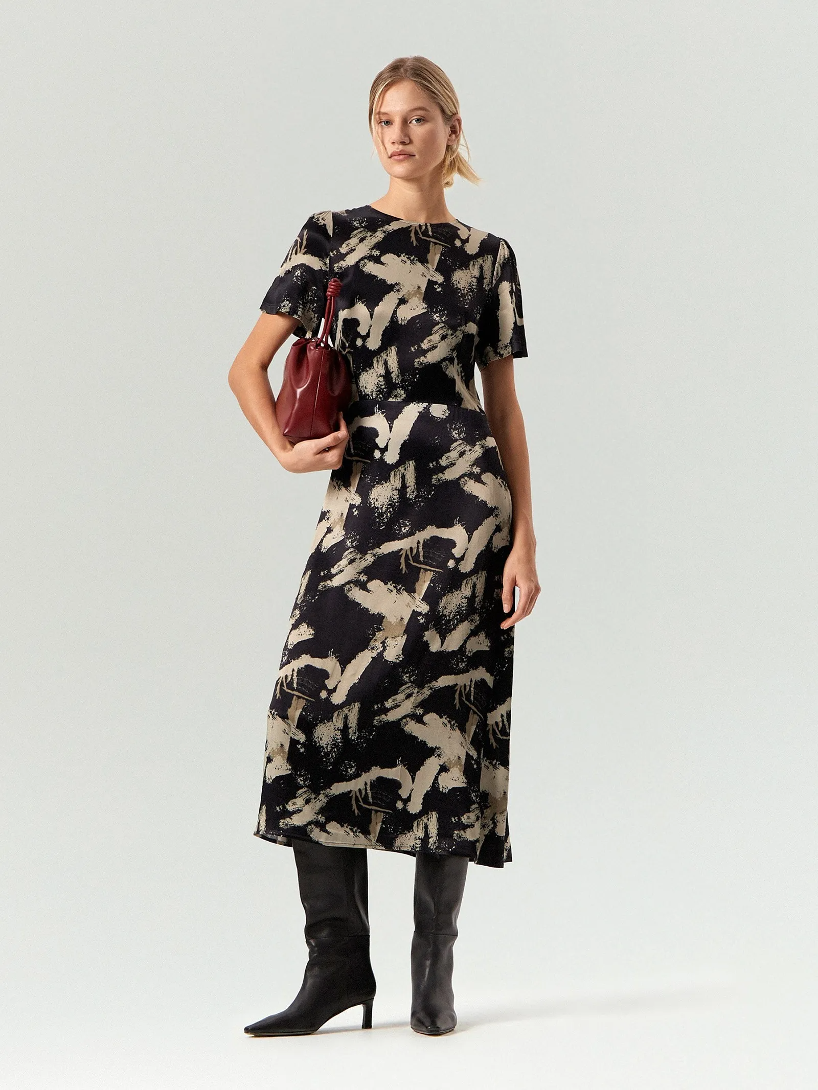 Универсальное платье с абстрактным принтом: крупные мазки в цвете полыни на чёрном фоне оживят повседневные образы. Модель A-силуэта с отрезной талией удачно садится на разные фигуры. Подходит под базовые чёрные жакеты. Изготовлено из приятной к телу вискозы, без подкладки. Застёгивается на молнию.