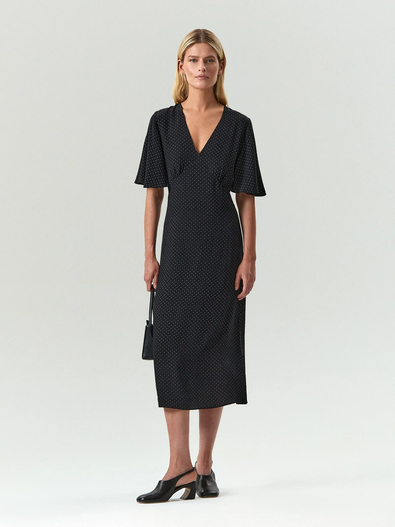 Платье на каждый день для тех, кто ценит сдержанную элегантность. Мелкий горох на чёрном фоне, V-вырез умеренной глубины и длина миди корректны в любой ситуации, включая деловые встречи. Рукава-крылья и женственный штрих в виде вытачек под грудью добавляют романтичности. Модель не облегает, но обрисовывает фигуру. Хорошо подойдёт на средний объём груди. Прикрывает плечи. Платье сделано из вискозы, на вискозной подкладке — ощущается очень комфортно.