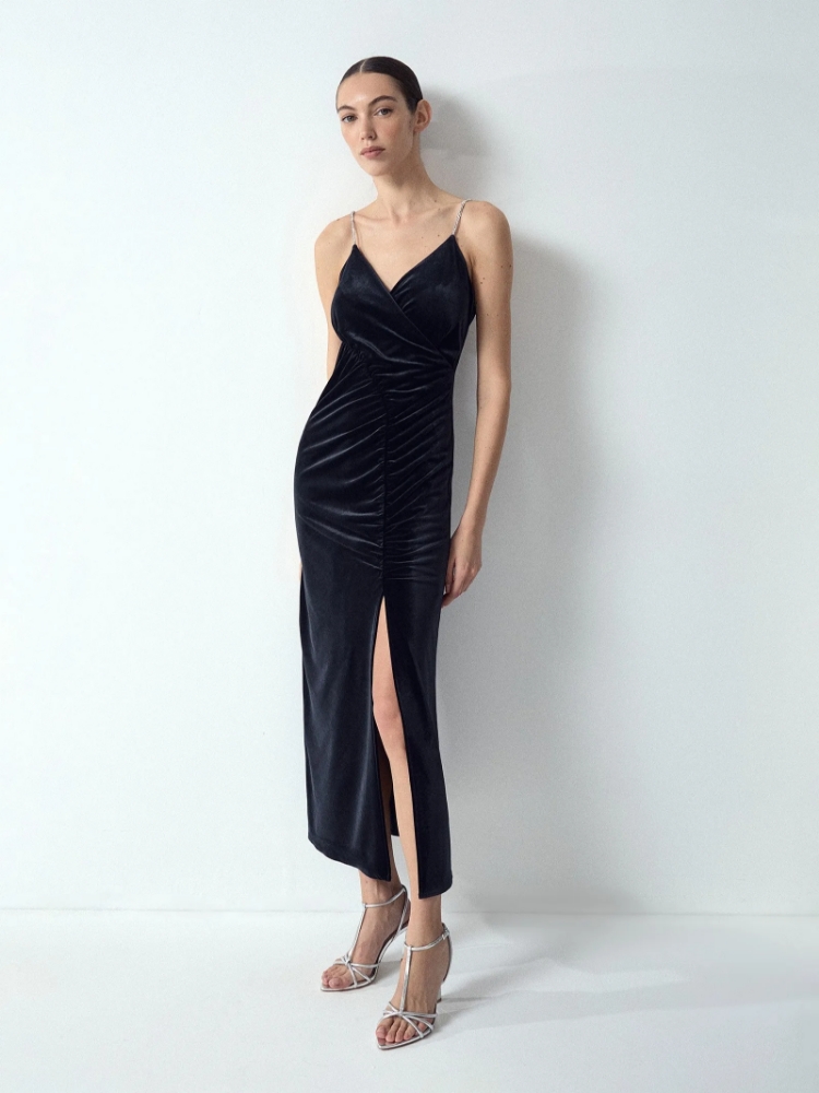 Бархатное платье станет элегантным выбором к особому случаю. Сверкающие акцентные бретели позволяют не использовать дополнительных аксессуаров. Драпировка выполнена так, чтобы визуально корректировать область талии и живота, скрывая определённые нюансы. Платье красиво смотрится и в маленьких, и в больших размерах. Эластичный материал делает посадку ещё более комфортной. Модель маломерит на один размер