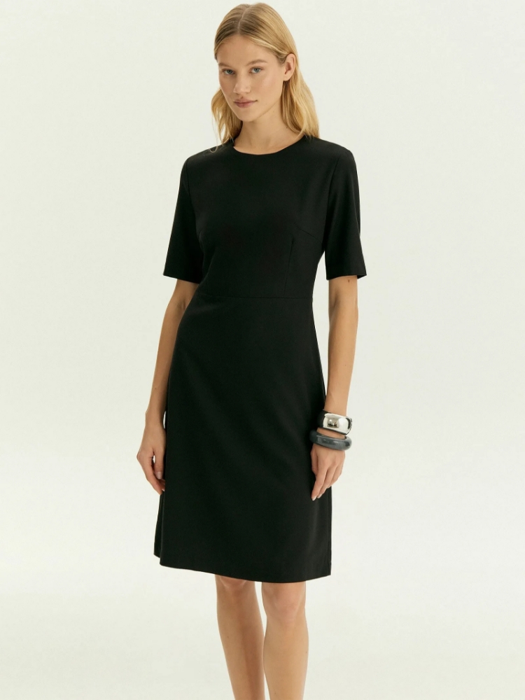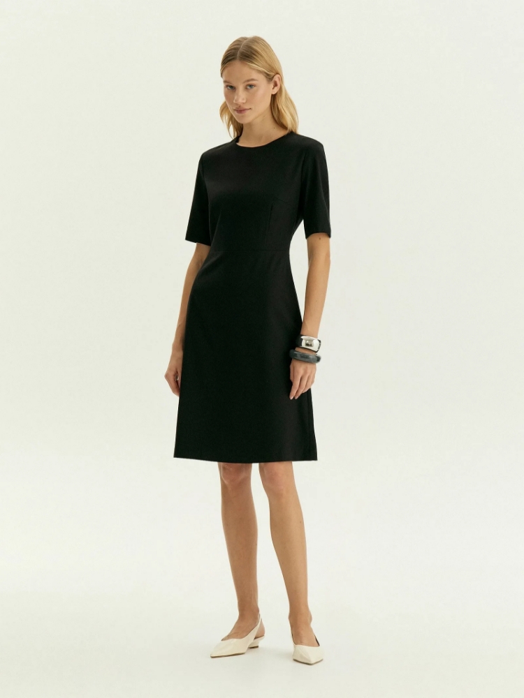 Чёрное платье A-силуэта чуть выше колена отлично подойдёт для повседневных и офисных образов. Выполнено из практичного материала с содержанием шерсти и с добавлением эластана, хорошо садится по фигуре. Изготовлено на приятной к телу подкладке из вискозы