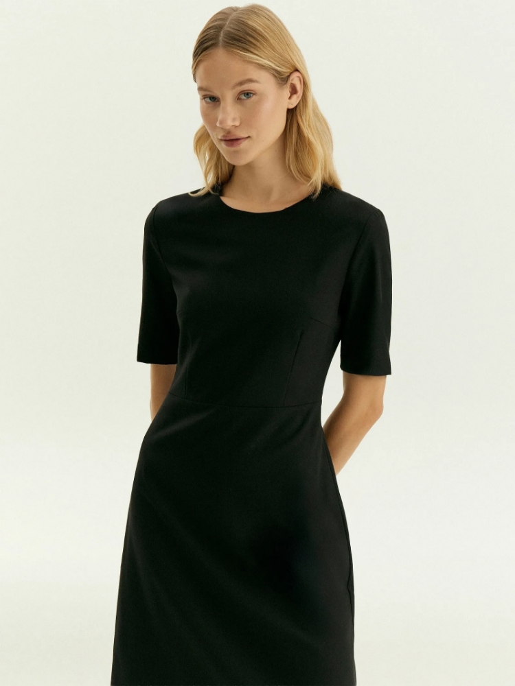 Чёрное платье A-силуэта чуть выше колена отлично подойдёт для повседневных и офисных образов. Выполнено из практичного материала с содержанием шерсти и с добавлением эластана, хорошо садится по фигуре. Изготовлено на приятной к телу подкладке из вискозы
